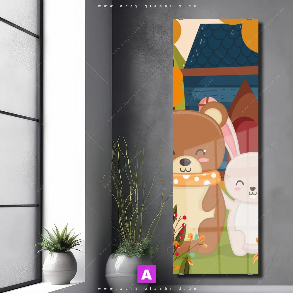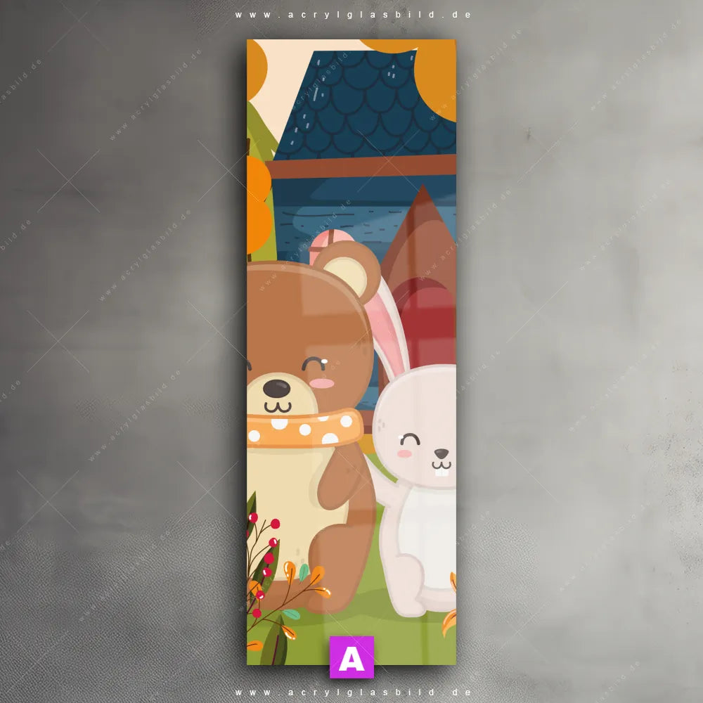 <b>Produktart:</b> Acrylglasbild | Glasbild | Wandbild aus Kunstglas | <b> Motiv:</b> Bär & Häschen | <b> Bildausrichtung:</b> Schmal | <b> Max. Motiv-Größe:</b> 335cm breit | 300cm hoch | <b> Verfügbare Formate: </b> Quadrat, Querformat, Hochformat, Panorama, Schmal, Rund | <b> Kategorie:</b> Tierwelt | <b> Farben:</b> Braun, Blau, Weiss, Ocker | <b> Kunstformen:</b> Vektor - Illustration | <b> Kunststile:</b> Abstrakt