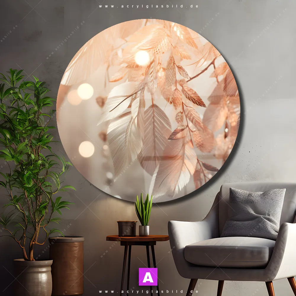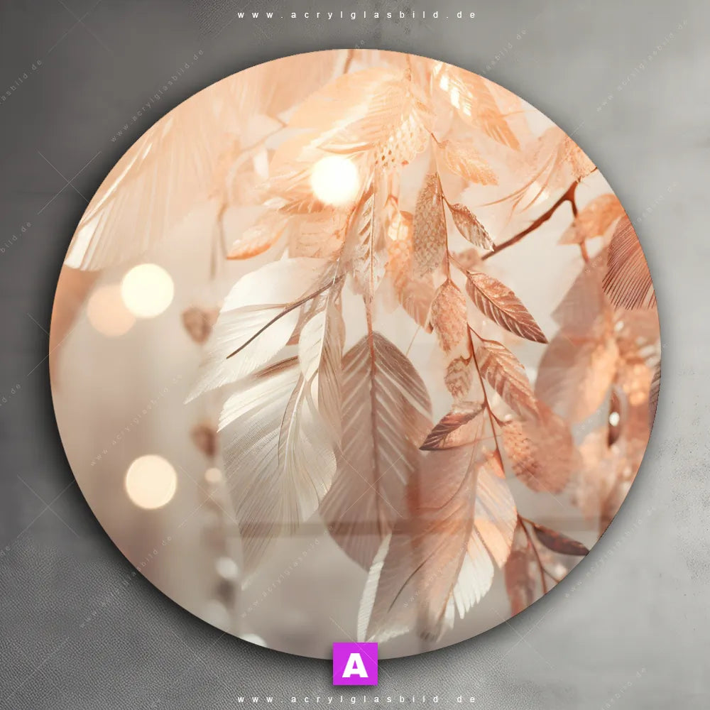 <b>Produktart:</b> Acrylglasbild | Glasbild | Wandbild aus Kunstglas | <b> Motiv:</b> Blätter im Sonnenlicht | <b> Bildausrichtung:</b> Rund | <b> Max. Motiv-Größe:</b> 270cm breit | 180cm hoch | <b> Verfügbare Formate: </b> Quadrat, Querformat, Hochformat, Panorama, Schmal, Rund | <b> Kategorie:</b> Blumen - Botanik | <b> Farben:</b> Gold, Orange | <b> Kunstformen:</b> Digitale Kunst, KI-generiertes Bild | <b> Kunststile:</b> Floral, Modern Art