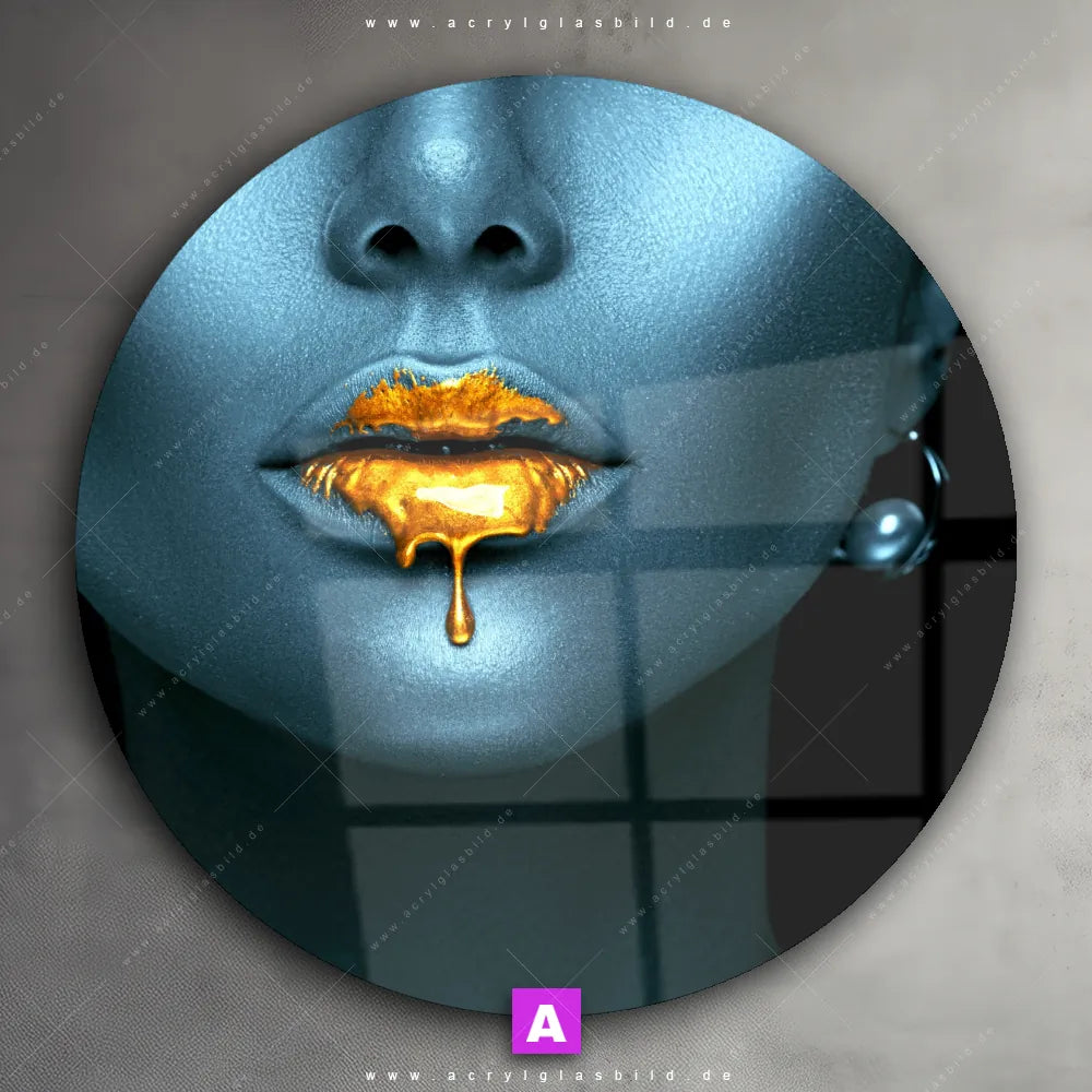 Das Motiv Blue Skin wird im UV-Direktdruck in den Farben Gold, Schwarz, Blau auf die Rückseite einer 5mm starken, transparenten Acrylglasplatte gedruckt. Das durchscheinende Motiv Goldene Lippen im Modern Art Stil wird anschließend vollflächig mit einer weißen Schicht hinterlegt. Das Porträts - Menschen Acrylglasbild | Rund erhält so eine bemerkenswerte Farbbrillanz, hohe Schärfe und erstaunliche Tiefenwirkung.