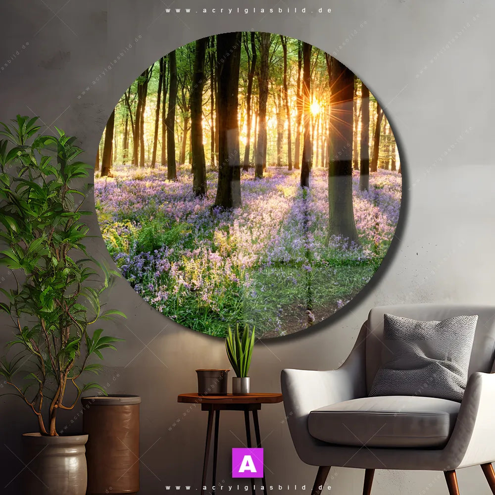 <b>Produktart:</b> Acrylglasbild | Glasbild | Wandbild aus Kunstglas | <b> Motiv:</b> Blühender Wald bei Sonnenaufgang | <b> Bildausrichtung:</b> Rund | <b> Max. Motiv-Größe:</b> 353cm breit | 180cm hoch | <b> Verfügbare Formate: </b> Quadrat, Querformat, Hochformat, Panorama, Schmal, Rund | <b> Kategorie:</b> Blumen - Botanik, Landschaften, Wald - Bäume | <b> Farben:</b> Lila, Hellgrün, Grün, Gold, Braun | <b> Kunstformen:</b> Fotografie | <b> Kunststile:</b> Natürlich - Realistisch