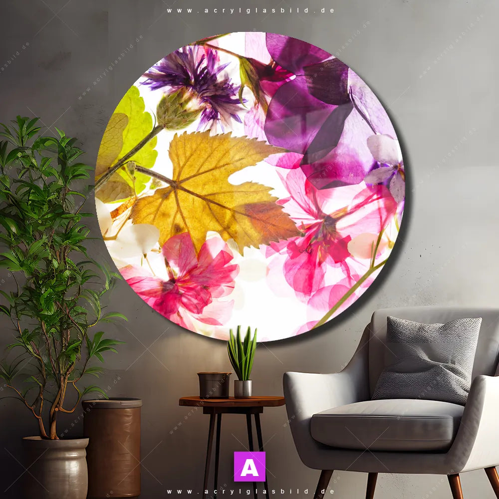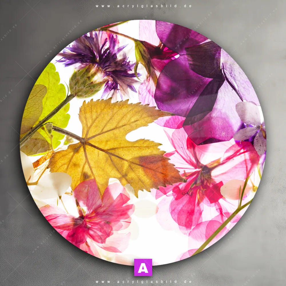 Hey du! Bist du es auch leid, auf langweilige, weiße Wände in deinem Raum zu starren und dich zu fragen, ob das der Sinn des Lebens ist? Unser Acrylglasbild mit dem Titel Blumen Collage No.2 im Format Rund verwandelt deine Wand in ein Kunstwerk und macht deinen Raum zum absoluten Hingucker.