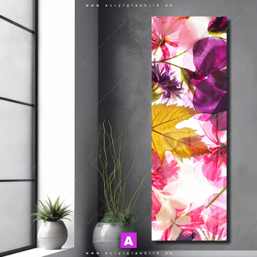 Das Motiv Blumen Collage No.2 wird im UV-Direktdruck in den Farben Beige, Braun, Orange, Ocker, Lila auf die Rückseite einer 5mm starken, transparenten Acrylglasplatte gedruckt. Das durchscheinende Motiv bunte Blätter und Blüten im Floral, Natürlich - Realistisch, Mixed Media Stil wird anschließend vollflächig mit einer weißen Schicht hinterlegt. Das Blumen - Botanik Acrylglasbild | Schmal erhält so eine bemerkenswerte Farbbrillanz, hohe Schärfe und erstaunliche Tiefenwirkung.