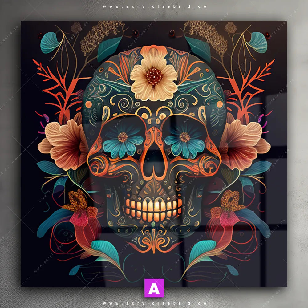Mit unserem Acrylglasbild verzierter Totenkopf aus der Kategorie Porträts - Menschen, Blumen - Botanik wirst du nie wieder auf deinem Sofa vor Langeweile versinken. Und wenn du ein Wandbild mit Schädel, Totenkopf, Skelett, Skull, Knochen, Blumen, Blüten, Blätter suchst, empfehlen wir dir unser Acrylglasbild Totenkopf mit Blumen in den faszinierenden Farben Gold, Schwarz, Rot, Türkis, Bunt, Orange. Es wurde in der Form eines Digitale Kunst gestaltet und harmoniert hervorragend mit deinem bevorzugten Modern Art, Floral Stil.