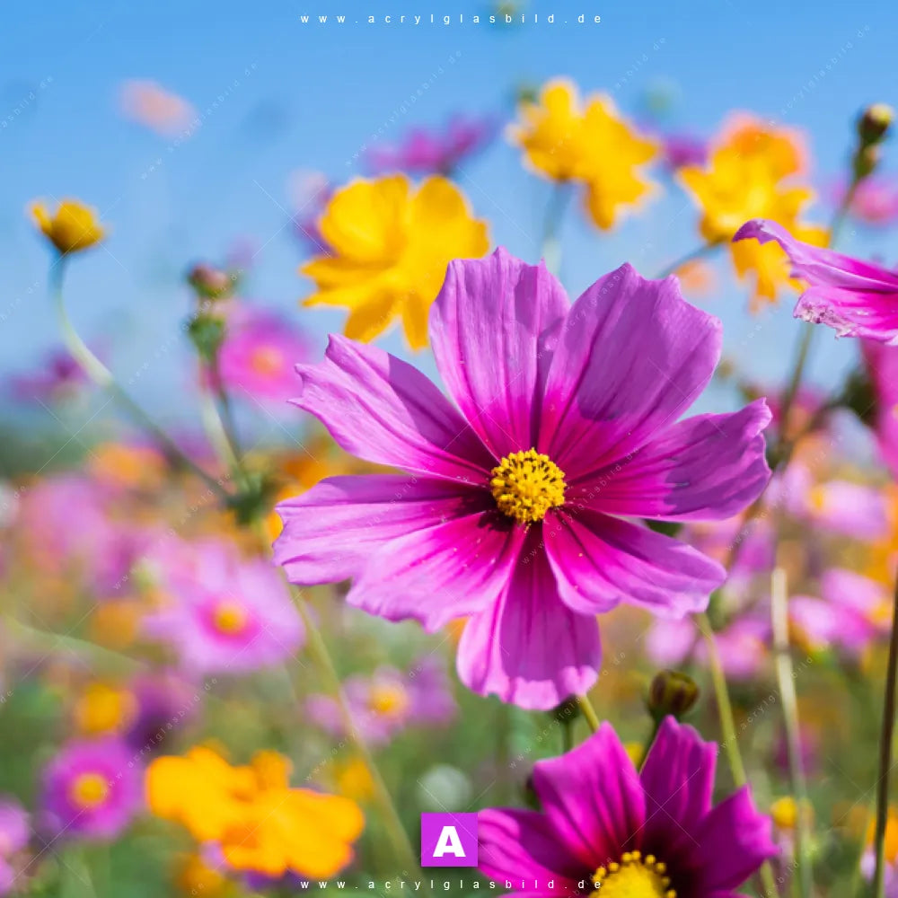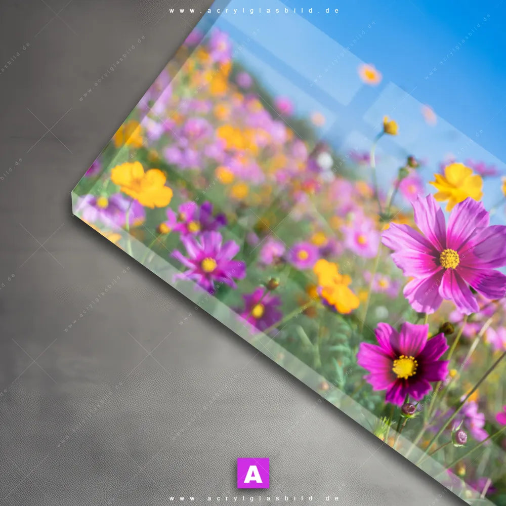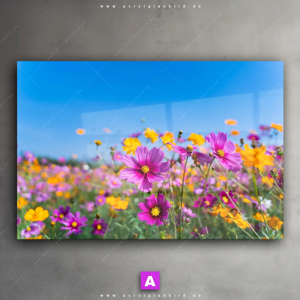<b>Produktart:</b> Acrylglasbild | Glasbild | Wandbild aus Kunstglas | <b> Motiv:</b> Blumenwiese unter blauem Himmel | <b> Bildausrichtung:</b> Querformat | <b> Max. Motiv-Größe:</b> 450cm breit | 300cm hoch | <b> Verfügbare Formate: </b> Quadrat, Querformat, Hochformat, Panorama, Schmal, Rund | <b> Kategorie:</b> Landschaften, Blumen - Botanik | <b> Farben:</b> Grün, Pink, Rosa, Gelb | <b> Kunstformen:</b> Fotografie | <b> Kunststile:</b> Floral, Natürlich - Realistisch