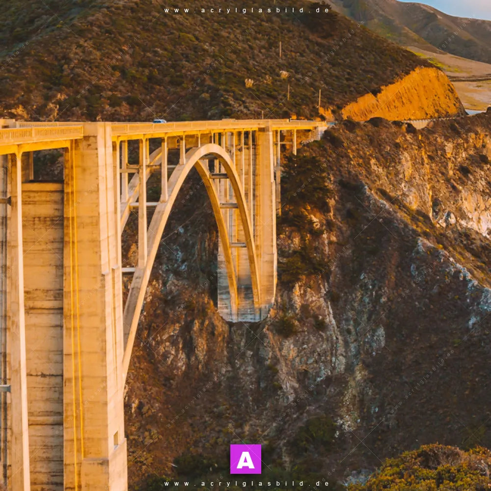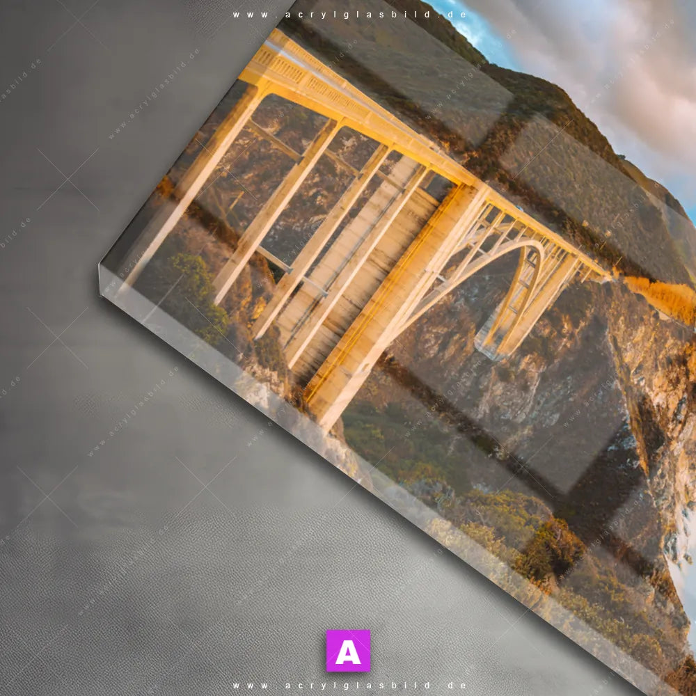 Das Motiv Brücke an der Küste wird im UV-Direktdruck in den Farben Blau, Orange, Hellblau auf die Rückseite einer 5mm starken, transparenten Acrylglasplatte gedruckt. Das durchscheinende Motiv Straßen am Meer im Natürlich - Realistisch Stil wird anschließend vollflächig mit einer weißen Schicht hinterlegt. Das Landschaften Acrylglasbild | Querformat erhält so eine bemerkenswerte Farbbrillanz, hohe Schärfe und erstaunliche Tiefenwirkung.