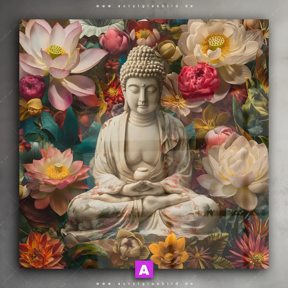 Acrylglasbild | Buddha in farbenfrohen Blumen | Quadrat