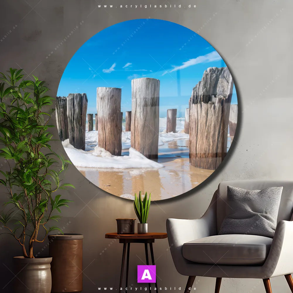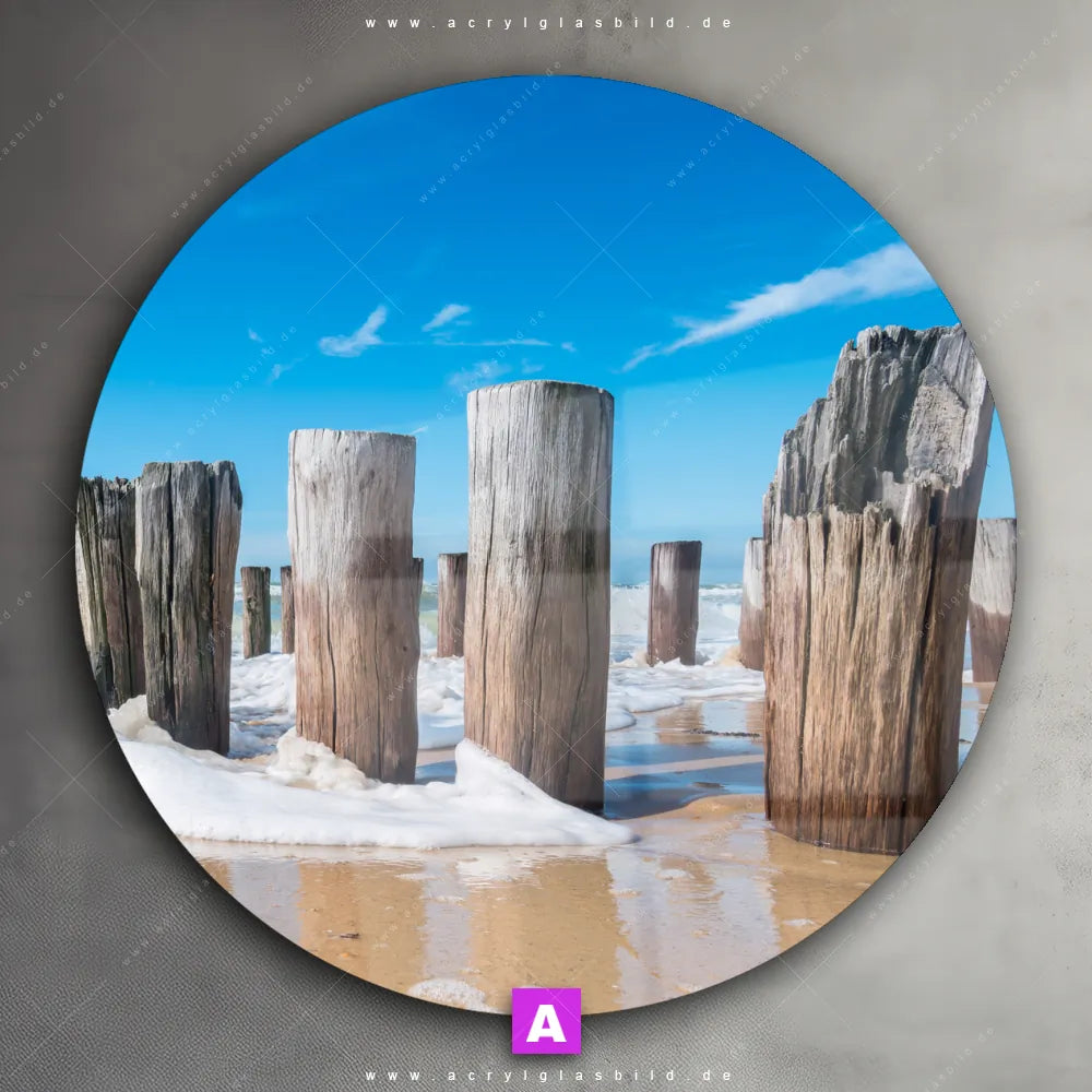 Hey du! Bist du es auch leid, auf langweilige, weiße Wände in deinem Raum zu starren und dich zu fragen, ob das der Sinn des Lebens ist? Unser Acrylglasbild mit dem Titel Buhnen in Wellen am Strand im Format Rund verwandelt deine Wand in ein Kunstwerk und macht deinen Raum zum absoluten Hingucker.