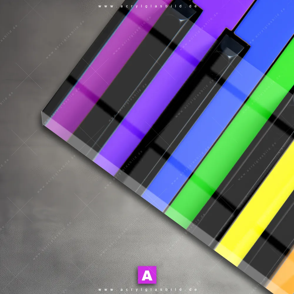 Das Motiv Bunte Klaviertasten wird im UV-Direktdruck in den Farben Bunt auf die Rückseite einer 5mm starken, transparenten Acrylglasplatte gedruckt. Das durchscheinende Motiv Tasten Klavier in Regenbogenfarben im Modern Art Stil wird anschließend vollflächig mit einer weißen Schicht hinterlegt. Das Muster - Texturen Acrylglasbild | Hochformat erhält so eine bemerkenswerte Farbbrillanz, hohe Schärfe und erstaunliche Tiefenwirkung.