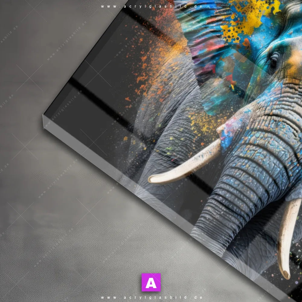 Das Motiv Bunter Elefant wird im UV-Direktdruck in den Farben Bunt auf die Rückseite einer 5mm starken, transparenten Acrylglasplatte gedruckt. Das durchscheinende Motiv Elefant mit Farbspritzern im Modern Art, Pop Art Stil wird anschließend vollflächig mit einer weißen Schicht hinterlegt. Das Tierwelt Acrylglasbild | Querformat erhält so eine bemerkenswerte Farbbrillanz, hohe Schärfe und erstaunliche Tiefenwirkung.