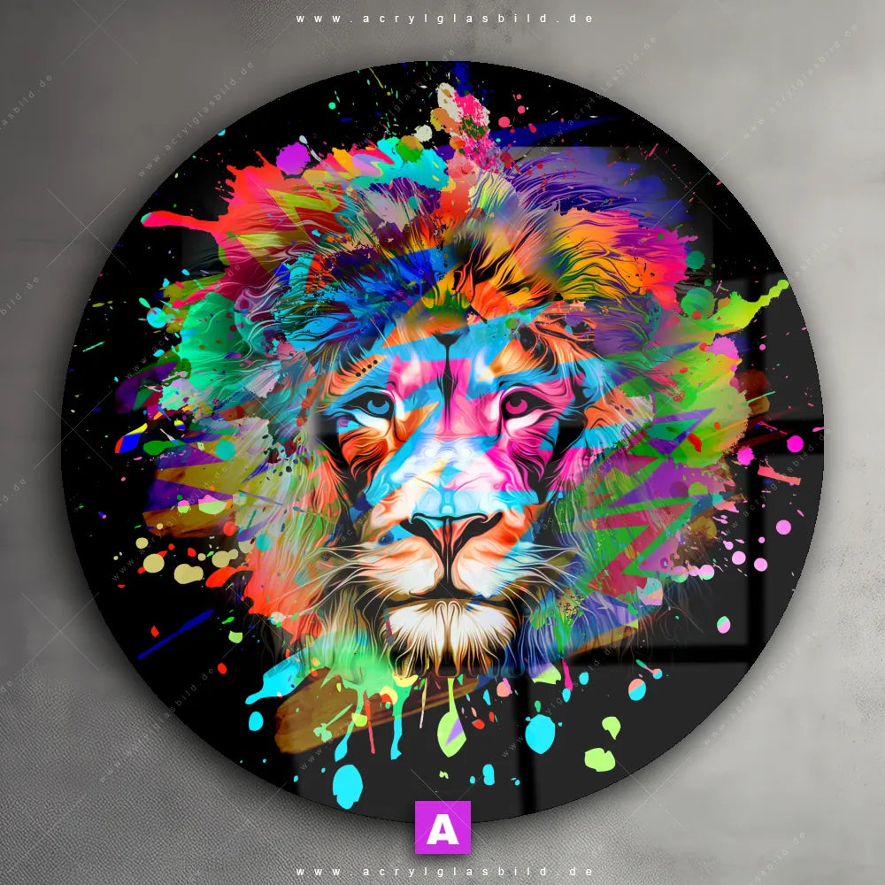 <b>Produktart:</b> Acrylglasbild | Glasbild | Wandbild aus Kunstglas | <b> Motiv:</b> Bunter Löwe Schwarz | <b> Bildausrichtung:</b> Rund | <b> Max. Motiv-Größe:</b> 270cm breit | 270cm hoch | <b> Verfügbare Formate: </b> Quadrat, Querformat, Hochformat, Panorama, Schmal, Rund | <b> Kategorie:</b> Tierwelt | <b> Farben:</b> Bunt | <b> Kunstformen:</b> Digitale Kunst | <b> Kunststile:</b> Abstrakt, Modern Art, Pop Art, Street Art