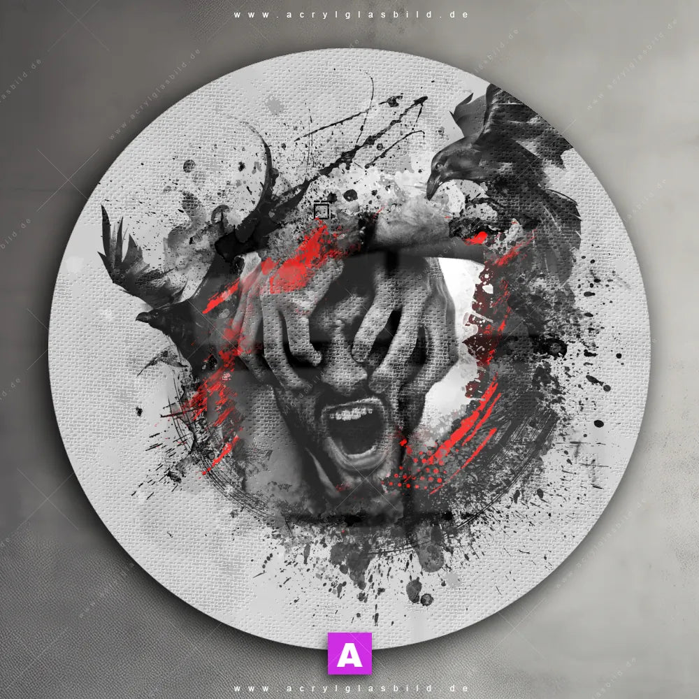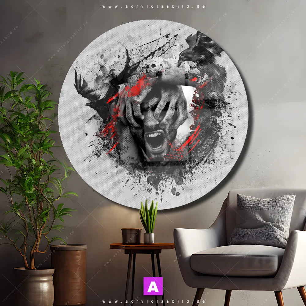 Das Motiv Der Schrei - Grunge-Stil wird im UV-Direktdruck in den Farben Weiss, Schwarz, Rot auf die Rückseite einer 5mm starken, transparenten Acrylglasplatte gedruckt. Das durchscheinende Motiv Kontraste der Seele im Grunge, Mixed Media, Modern Art, Schwarz - Weiss Stil wird anschließend vollflächig mit einer weißen Schicht hinterlegt. Das Porträts - Menschen Acrylglasbild | Rund erhält so eine bemerkenswerte Farbbrillanz, hohe Schärfe und erstaunliche Tiefenwirkung.