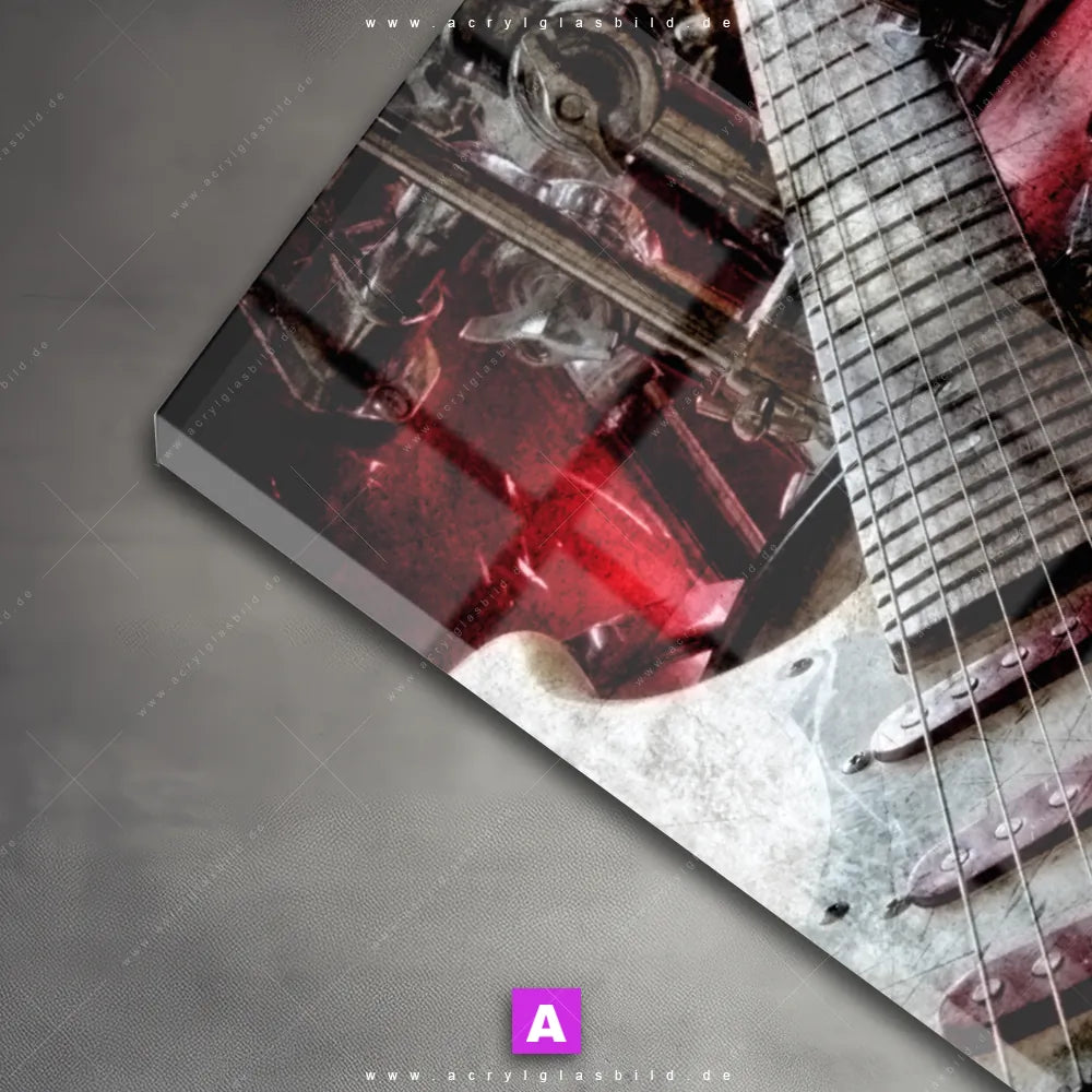 <b>Produktart:</b> Acrylglasbild | Glasbild | Wandbild aus Kunstglas | <b> Motiv:</b> E-Gitarre Retro Look | <b> Bildausrichtung:</b> Querformat | <b> Max. Motiv-Größe:</b> 450cm breit | 300cm hoch | <b> Verfügbare Formate: </b> Quadrat, Querformat, Hochformat, Panorama, Schmal, Rund | <b> Kategorie:</b> Porträts - Menschen | <b> Farben:</b> Rot, Schwarz, Weiss | <b> Kunstformen:</b> Fotografie | <b> Kunststile:</b> Retro - Vintage, Modern Art