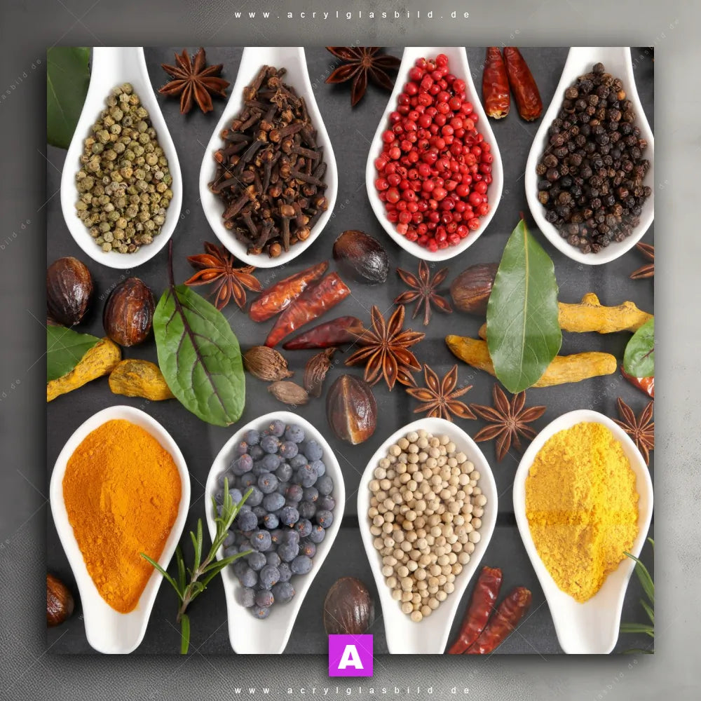 Das Motiv Exotische Geschmackswelten wird im UV-Direktdruck in den Farben Bunt, Weiss, Blau, Braun, Beige, Gelb , Grün, Lila, Ocker, Orange, Rot, Rosa auf die Rückseite einer 5mm starken, transparenten Acrylglasplatte gedruckt. Das durchscheinende Motiv Farbenfrohe Gewürze & Kräuter im Natürlich - Realistisch Stil wird anschließend vollflächig mit einer weißen Schicht hinterlegt. Das Essen - Trinken Acrylglasbild | Quadrat erhält so eine bemerkenswerte Farbbrillanz, hohe Schärfe und erstaunliche Tiefenwirkung.