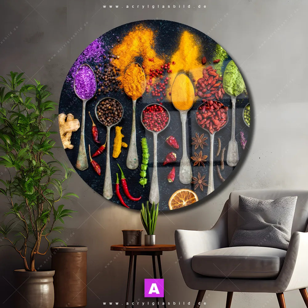 Hey du! Bist du es auch leid, auf langweilige, weiße Wände in deinem Raum zu starren und dich zu fragen, ob das der Sinn des Lebens ist? Unser Acrylglasbild mit dem Titel Exotische Gewürze auf Löffeln im Format Rund verwandelt deine Wand in ein Kunstwerk und macht deinen Raum zum absoluten Hingucker.