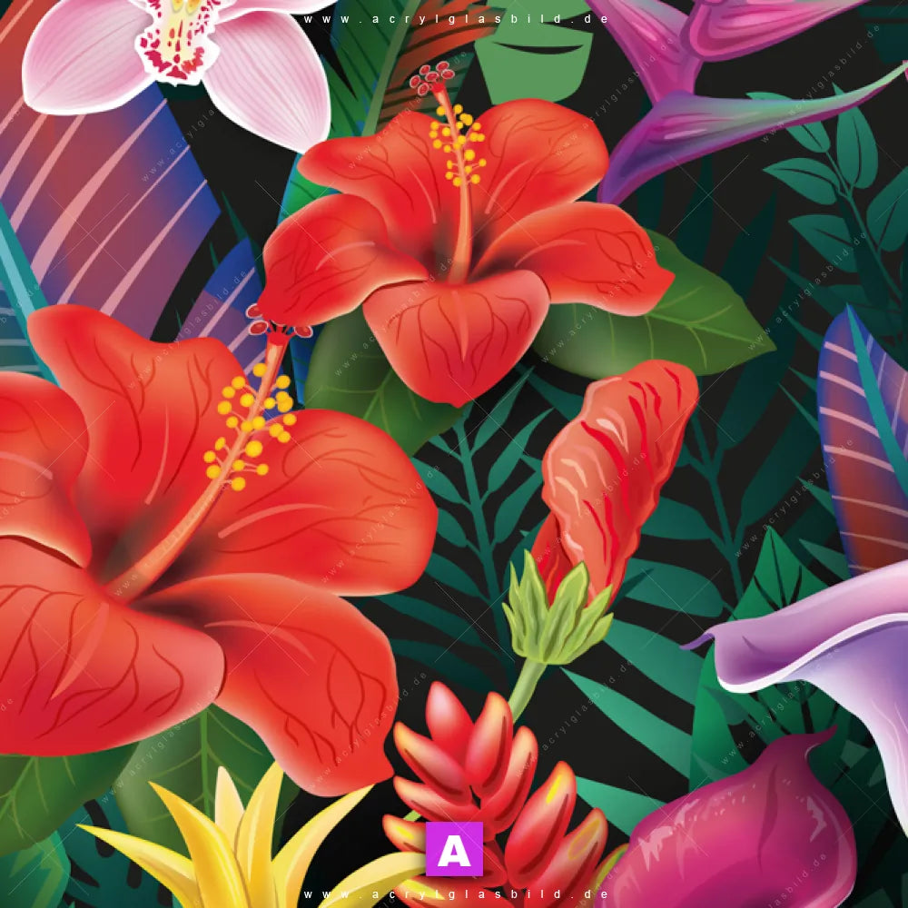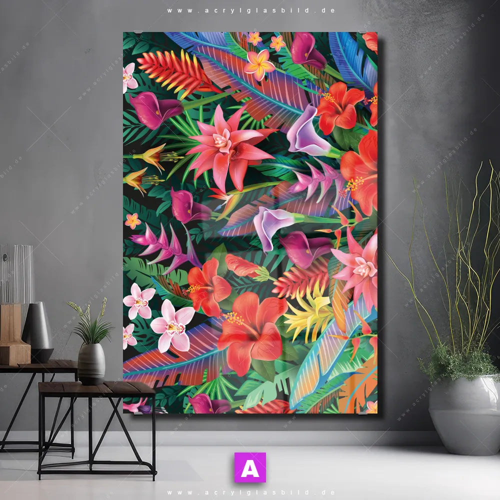 <b>Produktart:</b> Acrylglasbild | Glasbild | Wandbild aus Kunstglas | <b> Motiv:</b> Exotische Tropenpflanzen | <b> Bildausrichtung:</b> Hochformat | <b> Max. Motiv-Größe:</b> 300cm breit | 416cm hoch | <b> Verfügbare Formate: </b> Quadrat, Querformat, Hochformat, Panorama, Schmal, Rund | <b> Kategorie:</b>  Blumen - Botanik | <b> Farben:</b>  Grün, Rot, Gelb , Blau | <b> Kunstformen:</b>  Digitale Kunst, Vektor - Illustration | <b> Kunststile:</b>  Floral, Modern Art