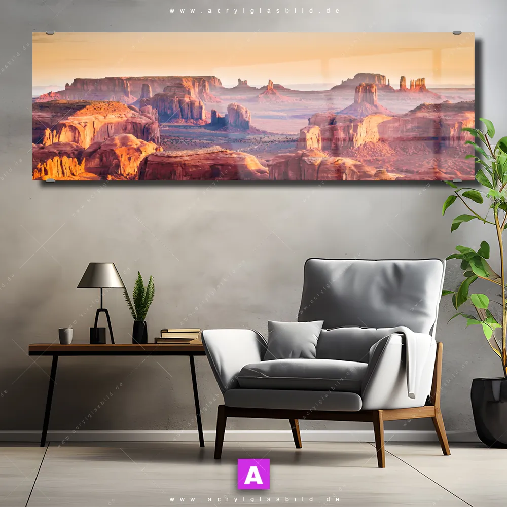Fehlt dir die Inspiration beim Anblick deiner Wände, sodass selbst das Zählen der Wandfarbtropfen aufregender erscheint? Keine Sorge, wir haben das perfekte Kunstwerk für dich! Mit unserem Acrylglasbild Felsen bei Sonnenuntergang im Panorama-Format verleihst du deinem Raum den dringend benötigten Wow-Faktor. Lass deine Wände mit unserem Monument Valley Felsen in der Abendröte Acrylglasbild zum Star werden!