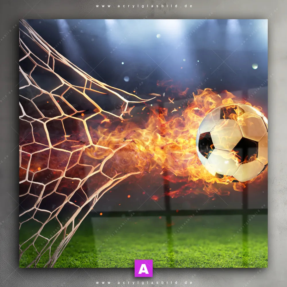 Mit unserem Acrylglasbild brennender Fußball im Netz aus der Kategorie Sport - Freizeit wirst du nie wieder auf deinem Sofa vor Langeweile versinken. Und wenn du ein Wandbild mit Sport, Fussball, Tor, Spielfeld, Ball, Torschuss, Netz, Meiserschaft, Feuer, Flammen, brennend suchst, empfehlen wir dir unser Acrylglasbild Fußball in Flammen in den faszinierenden Farben Grün, Blau, Orange, Weiss, Schwarz. Es wurde in der Form eines Digitale Kunst gestaltet und harmoniert hervorragend mit deinem bevorzugten Modern Art, Natürlich - Realistisch Stil.