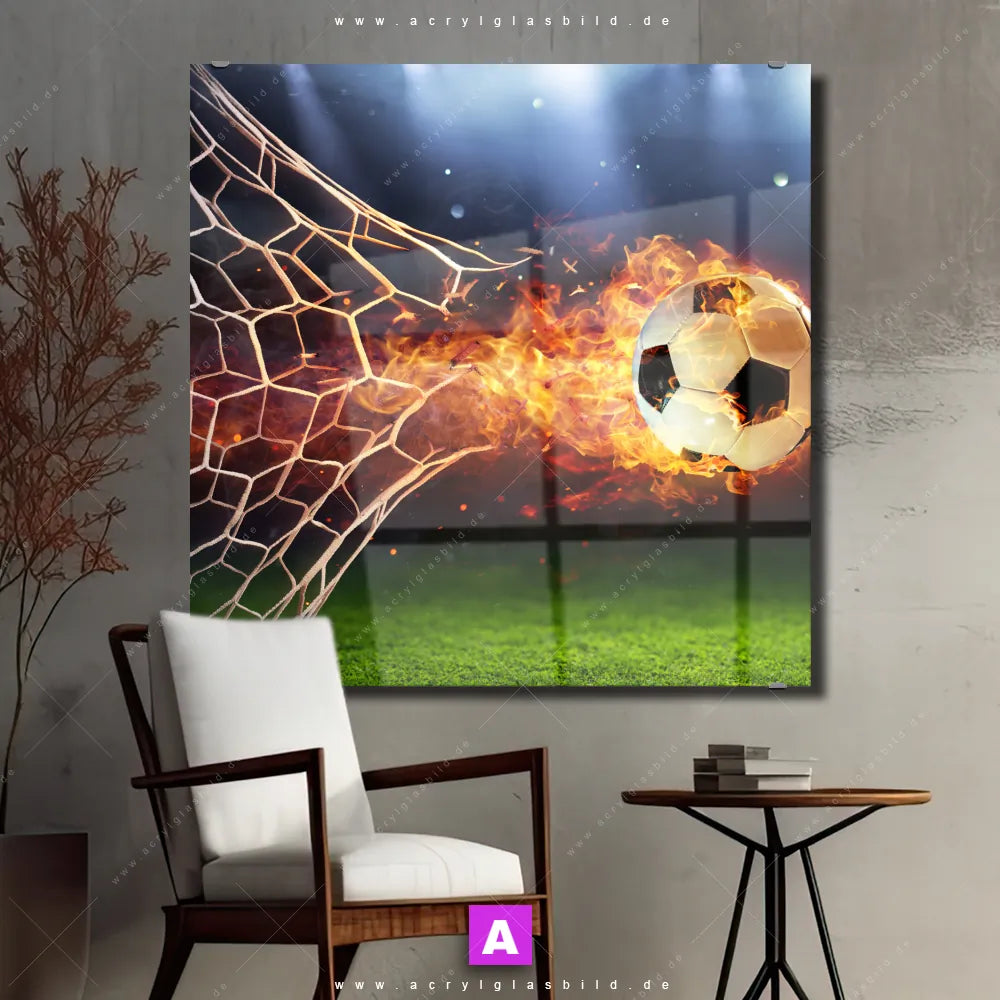 Bist du es leid, ständig auf deine tristen Wände zu starren und dir vorzustellen, wie viel lebendiger sie sein könnten? Wir haben die ideale Lösung für dich: Unser Acrylglasbild Feuriger Fussball im Quadrat-Format haucht deinen Räumen sofort neues Leben ein!
