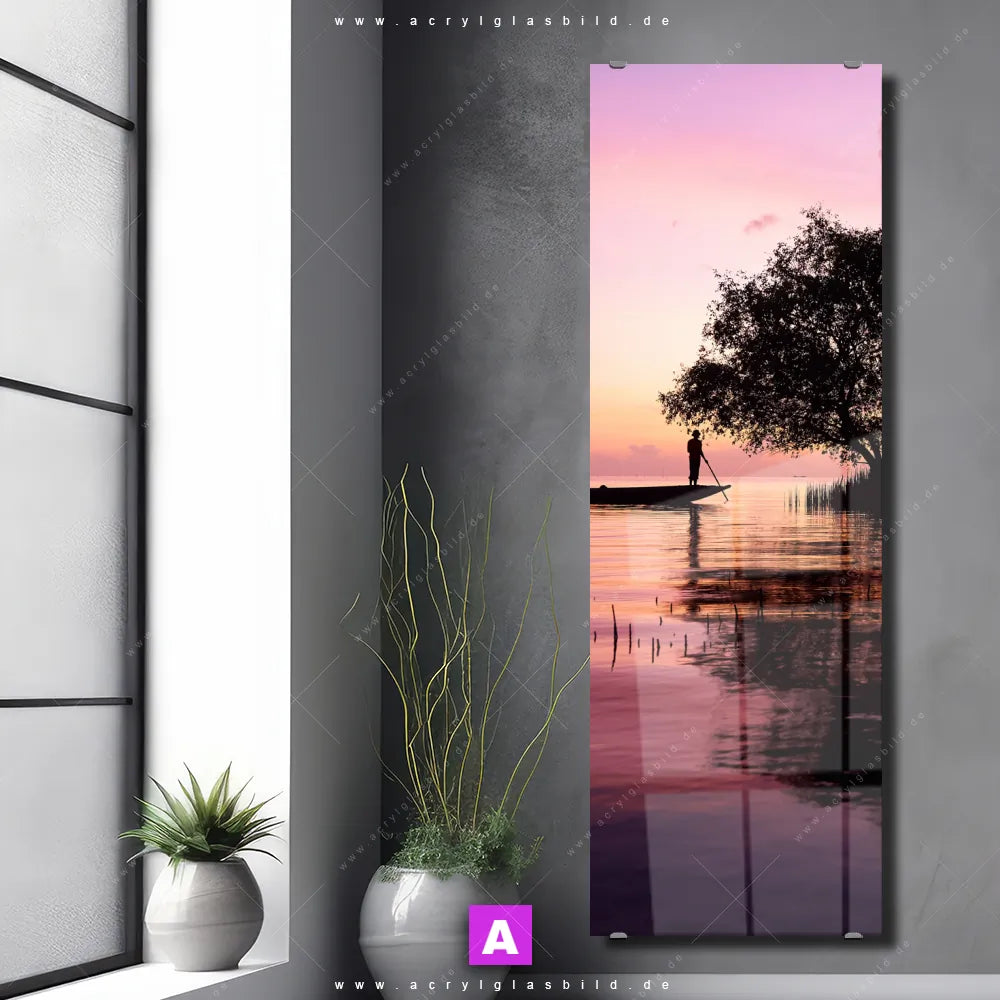 <b>Produktart:</b> Acrylglasbild | Glasbild | Wandbild aus Kunstglas | <b> Motiv:</b> Fischer auf Boot Sonnenaufgang | <b> Bildausrichtung:</b> Schmal | <b> Max. Motiv-Größe:</b> 450cm breit | 300cm hoch | <b> Verfügbare Formate: </b> Quadrat, Querformat, Hochformat, Panorama, Schmal, Rund | <b> Kategorie:</b> Landschaften | <b> Farben:</b> Lila, Rosa, Schwarz | <b> Kunstformen:</b> Fotografie | <b> Kunststile:</b> Natürlich - Realistisch