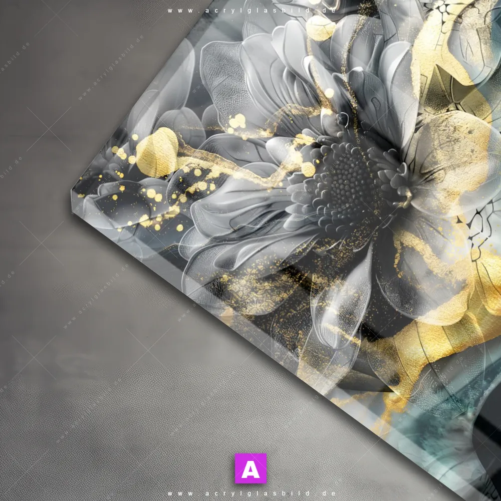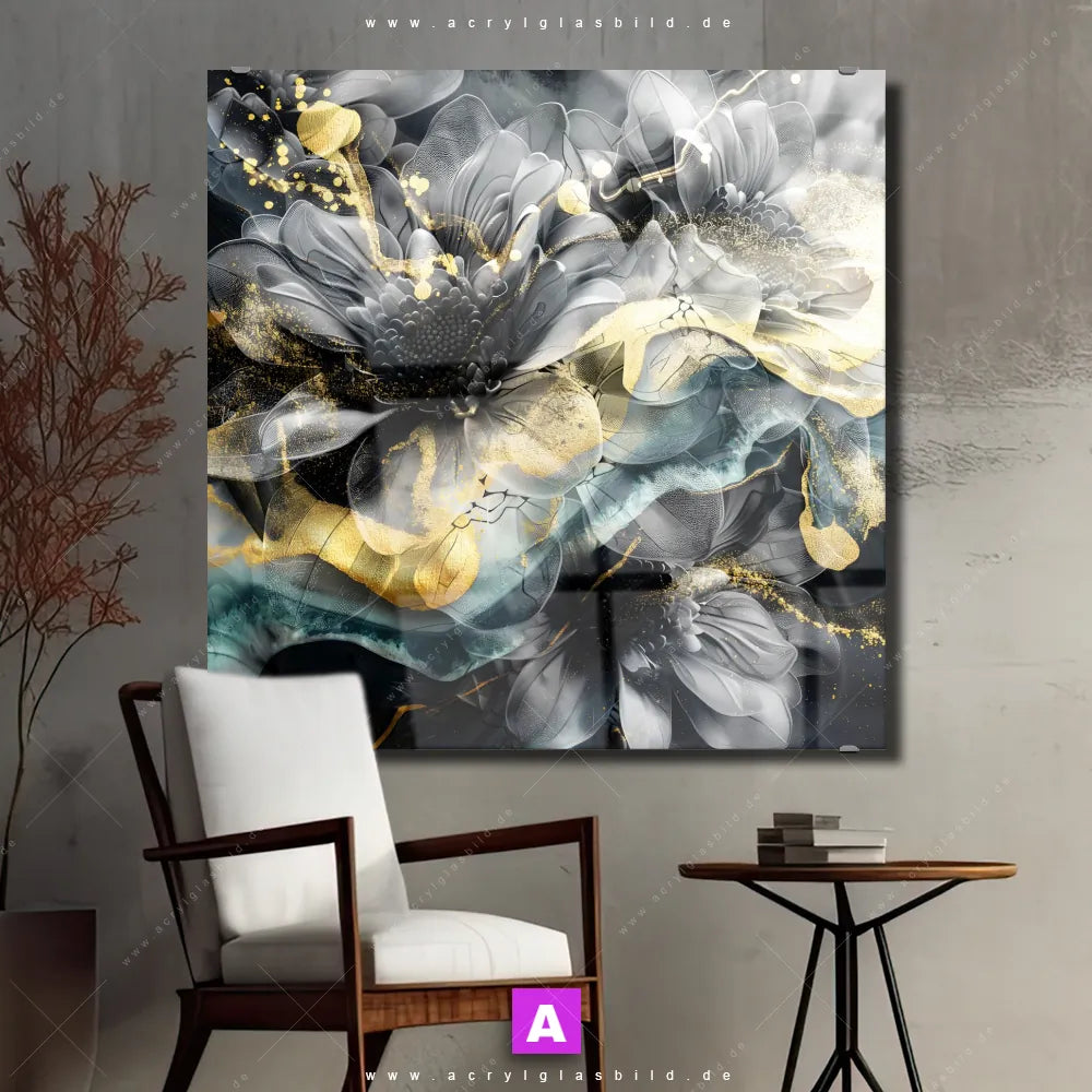 <b>Produktart:</b> Acrylglasbild | Glasbild | Wandbild aus Kunstglas | <b> Motiv:</b> Fluid Art - Duftende Blüten | <b> Bildausrichtung:</b> Quadrat | <b> Max. Motiv-Größe:</b> 300cm breit | 200cm hoch | <b> Verfügbare Formate: </b> Quadrat, Querformat, Hochformat, Panorama, Schmal, Rund | <b> Kategorie:</b> Blumen - Botanik, Muster - Texturen | <b> Farben:</b> Schwarz, Grau , Gold, Türkis | <b> Kunstformen:</b> Digitale Kunst, Kunst - Malerei | <b> Kunststile:</b> Abstrakt, Floral, Modern Art