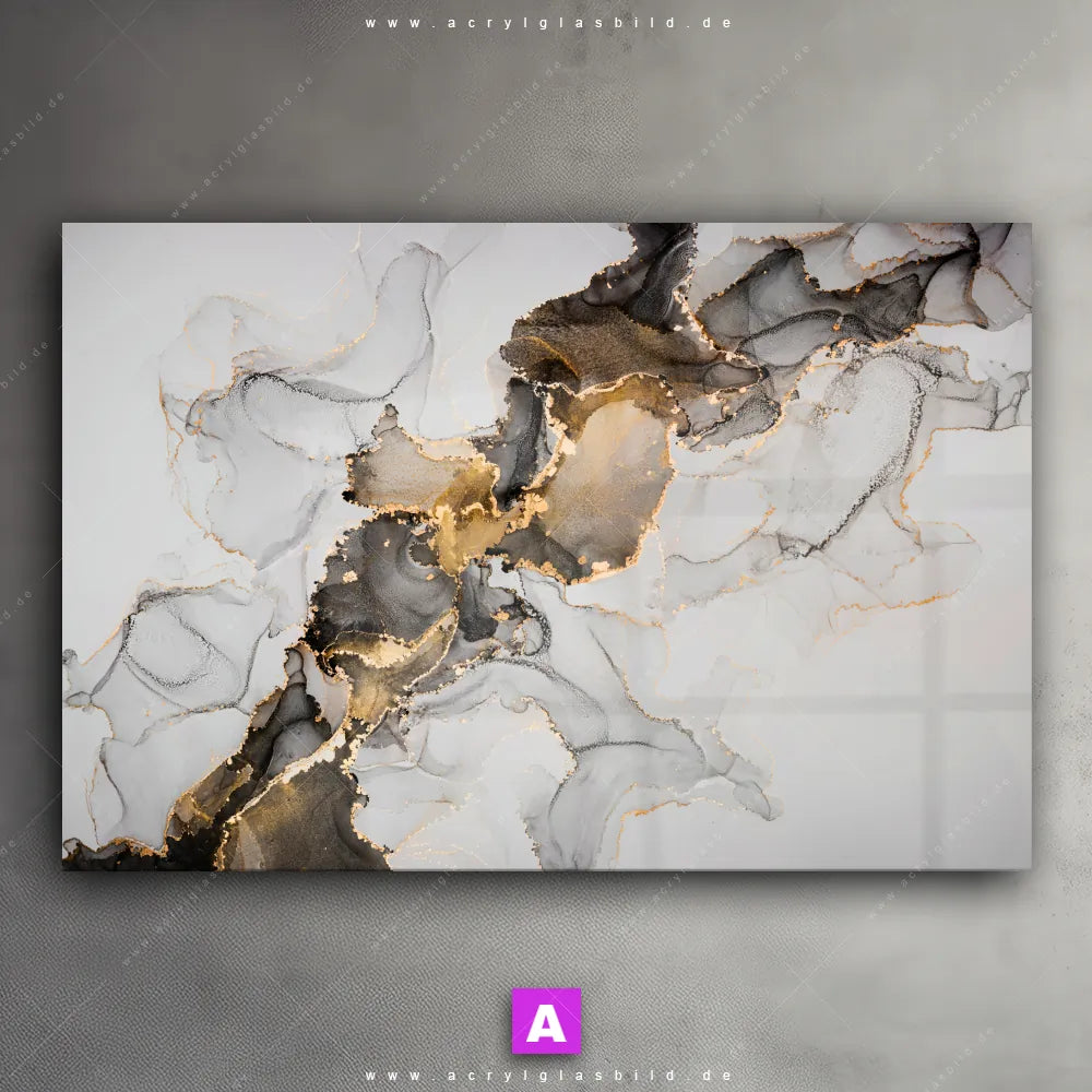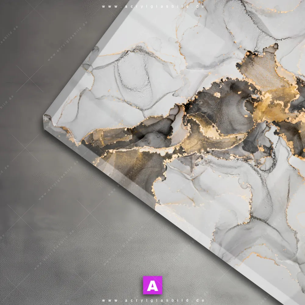 Das Motiv Fluid Art Gold wird im UV-Direktdruck in den Farben Gold, Weiss, Schwarz auf die Rückseite einer 5mm starken, transparenten Acrylglasplatte gedruckt. Das durchscheinende Motiv Marmorierungseffekte im Abstrakt, Modern Art Stil wird anschließend vollflächig mit einer weißen Schicht hinterlegt. Das Muster - Texturen Acrylglasbild | Querformat erhält so eine bemerkenswerte Farbbrillanz, hohe Schärfe und erstaunliche Tiefenwirkung.