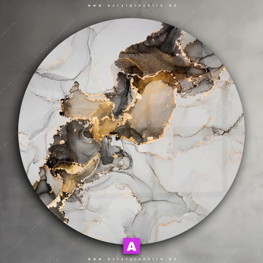 Das Motiv Fluid Art Gold wird im UV-Direktdruck in den Farben Gold, Weiss, Schwarz auf die Rückseite einer 5mm starken, transparenten Acrylglasplatte gedruckt. Das durchscheinende Motiv Marmorierungseffekte im Abstrakt, Modern Art Stil wird anschließend vollflächig mit einer weißen Schicht hinterlegt. Das Muster - Texturen Acrylglasbild | Rund erhält so eine bemerkenswerte Farbbrillanz, hohe Schärfe und erstaunliche Tiefenwirkung.
