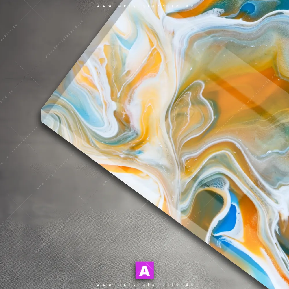 Das Motiv Fluid Art Lagune wird im UV-Direktdruck in den Farben Blau, Weiss, Beige, Ocker, Orange, Hellblau auf die Rückseite einer 5mm starken, transparenten Acrylglasplatte gedruckt. Das durchscheinende Motiv abstrakte Schneeoptik im Abstrakt, Modern Art Stil wird anschließend vollflächig mit einer weißen Schicht hinterlegt. Das Muster - Texturen Acrylglasbild | Hochformat erhält so eine bemerkenswerte Farbbrillanz, hohe Schärfe und erstaunliche Tiefenwirkung.