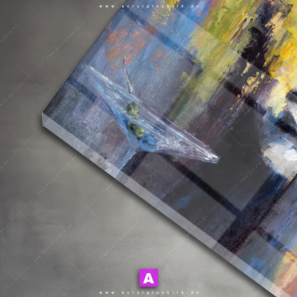 <b>Produktart:</b> Acrylglasbild | Glasbild | Wandbild aus Kunstglas | <b> Motiv:</b> Frau & Martini Cocktail | <b> Bildausrichtung:</b> Querformat | <b> Max. Motiv-Größe:</b> 124cm breit | 180cm hoch | <b> Verfügbare Formate: </b> Quadrat, Querformat, Hochformat, Panorama, Schmal, Rund | <b> Kategorie:</b> Porträts - Menschen | <b> Farben:</b> Blau, Weiss, Gelb , Rot, Schwarz | <b> Kunstformen:</b> Kunst - Malerei | <b> Kunststile:</b> Abstrakt, Modern Art