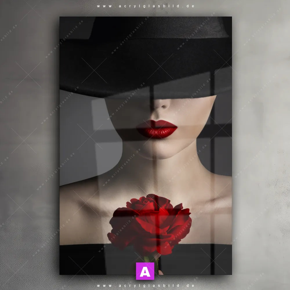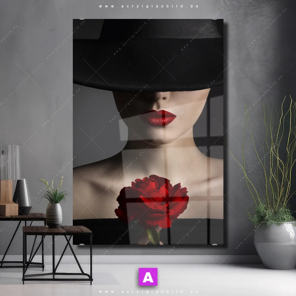 Hallo, auf Wiedersehen langweilige Wände! Gib deinem Raum ein stilvolles Upgrade mit unserem Acrylglasbild Frau mit Hut & Rose im Hochformat, das nicht nur Bar - Gastronomie, Friseur - Beauty, Wohnzimmer - Schlafzimmer, sondern auch jeden anderen Raum im Handumdrehen auf ein neues Niveau hebt!