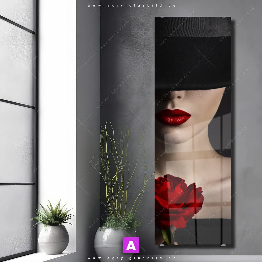 <b>Produktart:</b> Acrylglasbild | Glasbild | Wandbild aus Kunstglas | <b> Motiv:</b> Frau mit Hut & Rose | <b> Bildausrichtung:</b> Schmal | <b> Max. Motiv-Größe:</b> 450cm breit | 300cm hoch | <b> Verfügbare Formate: </b> Quadrat, Querformat, Hochformat, Panorama, Schmal, Rund | <b> Kategorie:</b> Porträts - Menschen | <b> Farben:</b> Schwarz, Rot, Beige | <b> Kunstformen:</b> Fotografie | <b> Kunststile:</b> Minimalistisch, Modern Art, Schwarz - Weiss