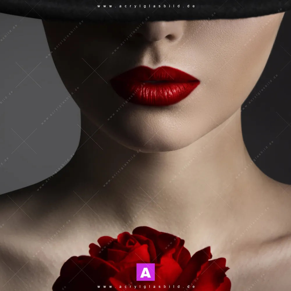 Die einzigartigen Farben in Schwarz, Rot, Beige machen das Acrylglasbild elegante Frau mit Frau, Lippen, Mund, Porträt, modern, Beauty, Schönheit, Mädchen, Rose, Blume, Blüte, Hut, Gesicht zu einem echten Hingucker. Egal ob deine Einrichtung minimalistisch, modern oder doch eher wild und ausgefallen ist - unser Acrylglasbild elegante Dame im Minimalistisch, Modern Art, Schwarz - Weiss Stil passt immer, auch in Bar - Gastronomie, Friseur - Beauty, Wohnzimmer - Schlafzimmer.