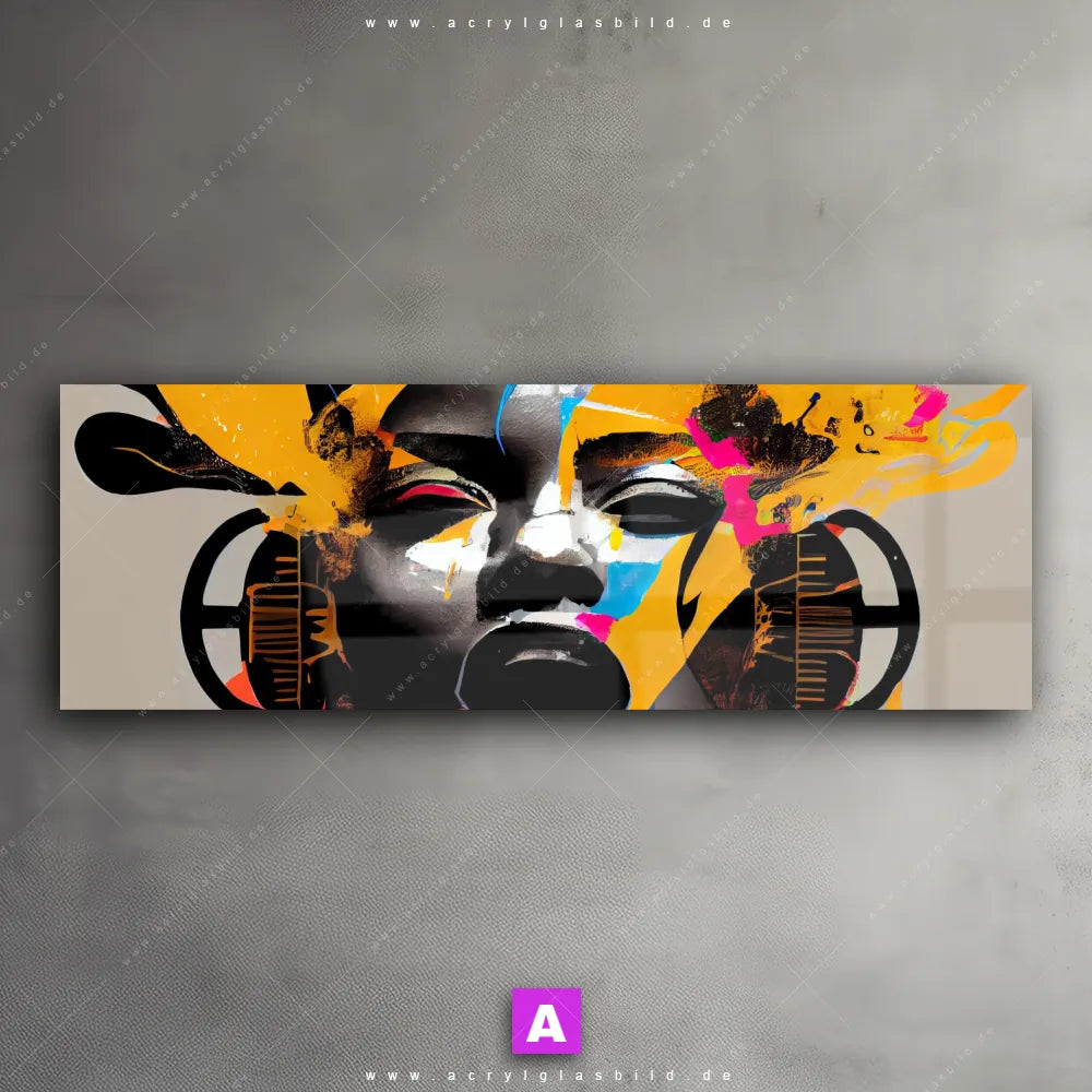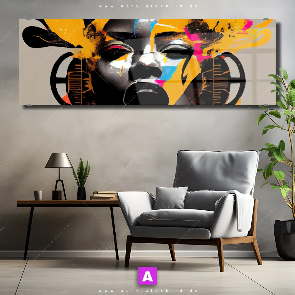 Das Motiv Frau mit Kopfhörern wird im UV-Direktdruck in den Farben Beige, Schwarz, Orange, Pink auf die Rückseite einer 5mm starken, transparenten Acrylglasplatte gedruckt. Das durchscheinende Motiv Buntes Gesicht einer musikalischen Frau im Abstrakt, Modern Art Stil wird anschließend vollflächig mit einer weißen Schicht hinterlegt. Das Porträts - Menschen Acrylglasbild | Panorama erhält so eine bemerkenswerte Farbbrillanz, hohe Schärfe und erstaunliche Tiefenwirkung.