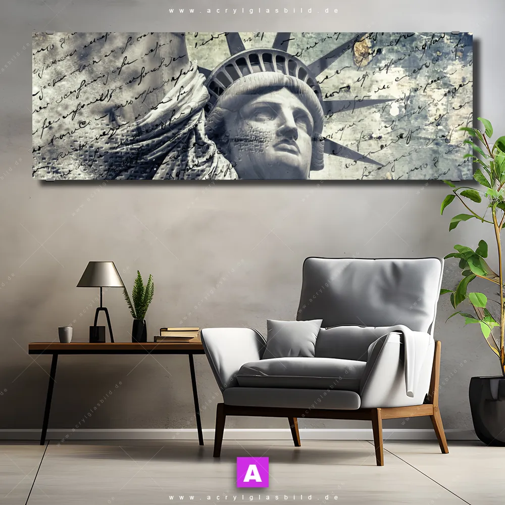 Fehlt dir die Inspiration beim Anblick deiner Wände, sodass selbst das Zählen der Wandfarbtropfen aufregender erscheint? Keine Sorge, wir haben das perfekte Kunstwerk für dich! Mit unserem Acrylglasbild Freiheitsstatue im Sandsturm im Panorama-Format verleihst du deinem Raum den dringend benötigten Wow-Faktor. Lass deine Wände mit unserem Künstlerische Freiheitsstatue mit Schriftzug Acrylglasbild zum Star werden!