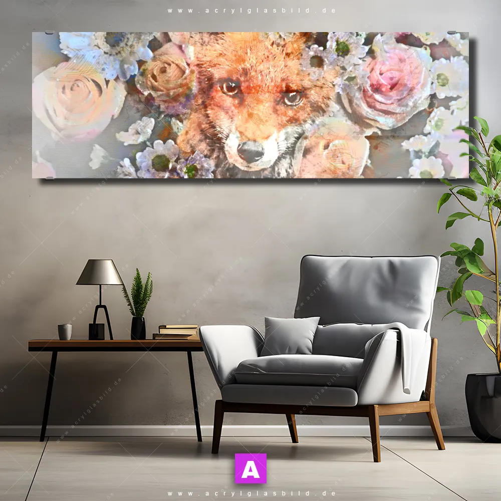 <b>Produktart:</b> Acrylglasbild | Glasbild | Wandbild aus Kunstglas | <b> Motiv:</b> Fuchs & Blumen | <b> Bildausrichtung:</b> Panorama | <b> Max. Motiv-Größe:</b> 240cm breit | 360cm hoch | <b> Verfügbare Formate: </b> Quadrat, Querformat, Hochformat, Panorama, Schmal, Rund | <b> Kategorie:</b> Tierwelt, Blumen - Botanik | <b> Farben:</b> Beige, Orange, Rosa, Weiss | <b> Kunstformen:</b> Kunst - Malerei | <b> Kunststile:</b> Floral, Modern Art