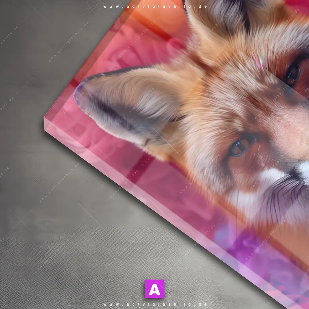 <b>Produktart:</b> Acrylglasbild | Glasbild | Wandbild aus Kunstglas | <b> Motiv:</b> Fuchs in Farbnebel | <b> Bildausrichtung:</b> Hochformat | <b> Max. Motiv-Größe:</b> 450cm breit | 300cm hoch | <b> Verfügbare Formate: </b> Quadrat, Querformat, Hochformat, Panorama, Schmal, Rund | <b> Kategorie:</b> Tierwelt | <b> Farben:</b> Orange, Pink, Lila | <b> Kunstformen:</b> Digitale Kunst, Fotografie | <b> Kunststile:</b> Pop Art, Modern Art