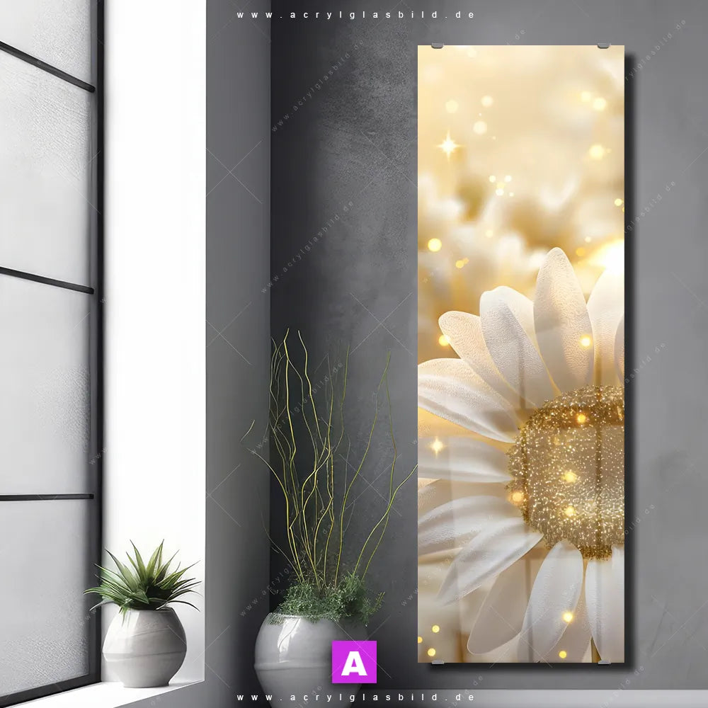 Die einzigartigen Farben in Weiss, Gold machen das Acrylglasbild Glitzernde Gänseblümchen Kunst mit Gänseblümchen, Blüten, Natur, Pflanze, Glitzer, Blütenmeer zu einem echten Hingucker. Egal ob deine Einrichtung minimalistisch, modern oder doch eher wild und ausgefallen ist - unser Acrylglasbild Leuchtende Blütenpracht im Floral, Modern Art Stil passt immer, auch in Wohnzimmer - Schlafzimmer, Arzt - Praxis, Flur - Eingangsbereich.