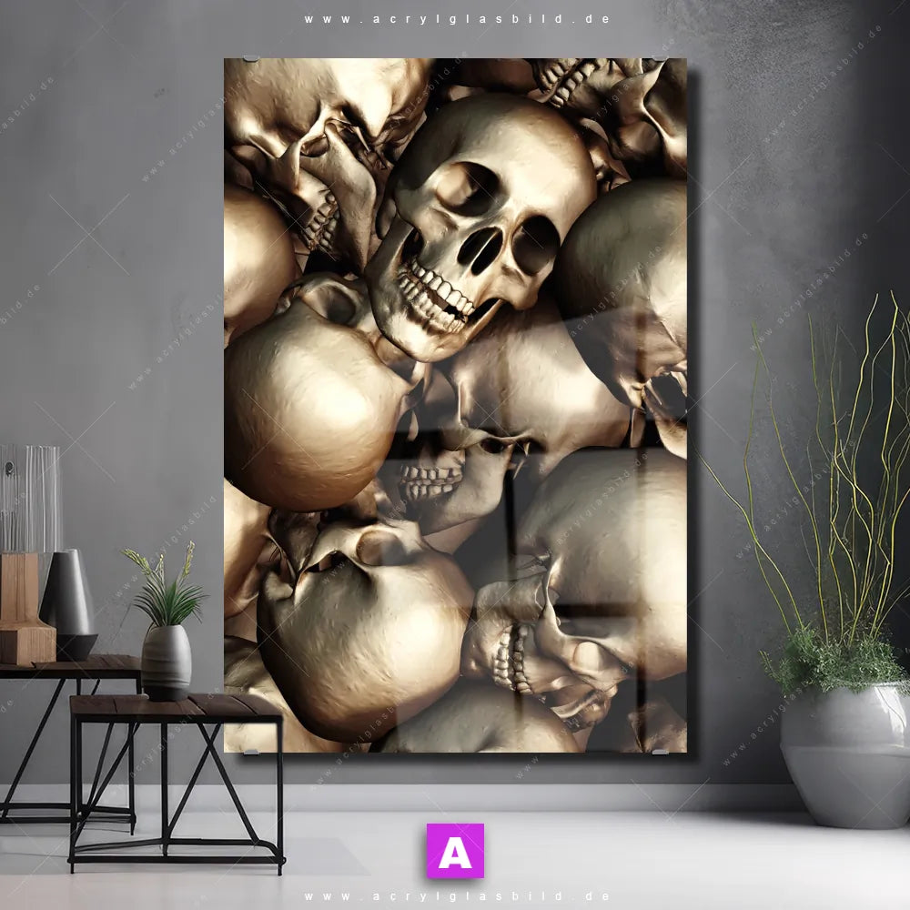 Hallo, auf Wiedersehen langweilige Wände! Gib deinem Raum ein stilvolles Upgrade mit unserem Acrylglasbild Goldene Schädel im Hochformat, das nicht nur Bar - Gastronomie, Wohnzimmer - Schlafzimmer, sondern auch jeden anderen Raum im Handumdrehen auf ein neues Niveau hebt!