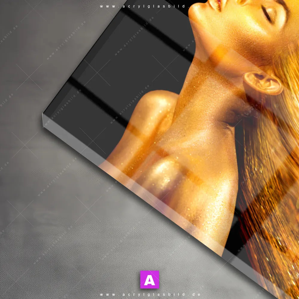 Das Motiv Goldenes Haar wird im UV-Direktdruck in den Farben Gold, Schwarz auf die Rückseite einer 5mm starken, transparenten Acrylglasplatte gedruckt. Das durchscheinende Motiv Frau mit goldigem Haar im Modern Art Stil wird anschließend vollflächig mit einer weißen Schicht hinterlegt. Das Porträts - Menschen Acrylglasbild | Querformat erhält so eine bemerkenswerte Farbbrillanz, hohe Schärfe und erstaunliche Tiefenwirkung.