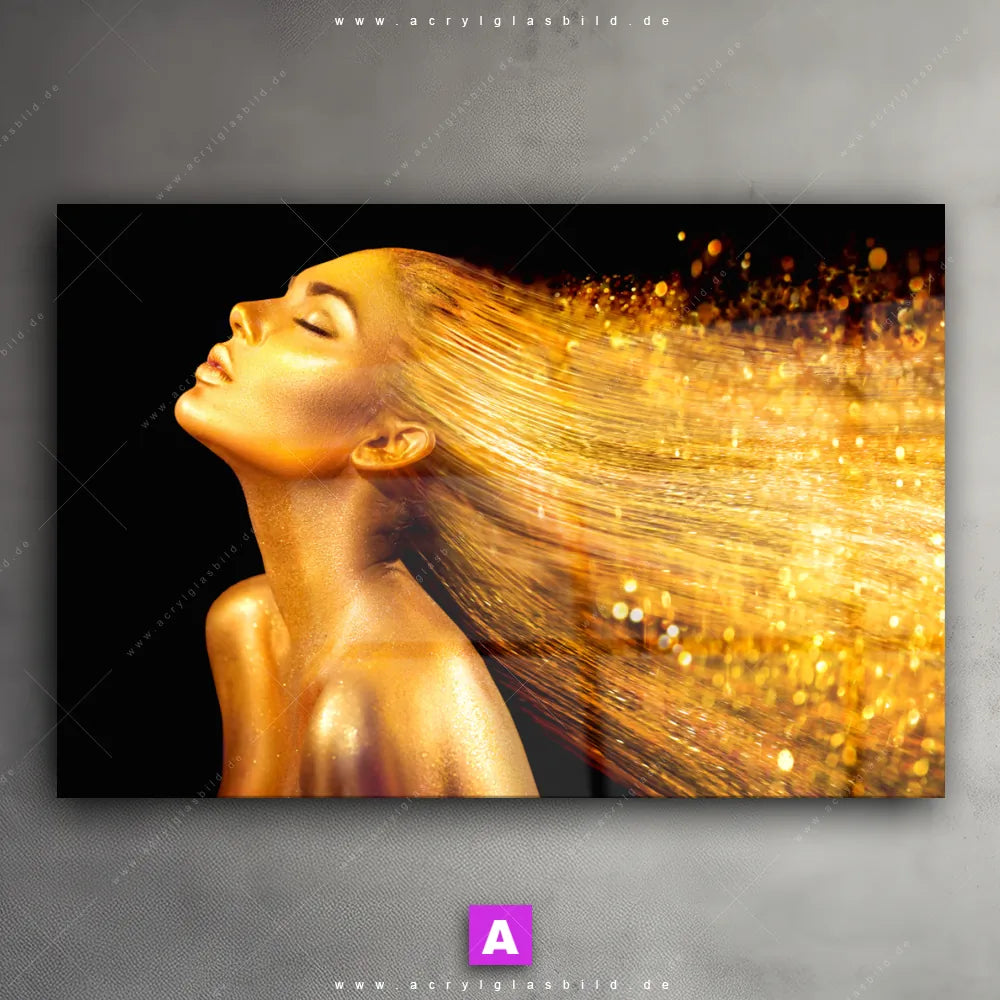 <b>Produktart:</b> Acrylglasbild | Glasbild | Wandbild aus Kunstglas | <b> Motiv:</b> Goldenes Haar | <b> Bildausrichtung:</b> Querformat | <b> Max. Motiv-Größe:</b> 400cm breit | 150cm hoch | <b> Verfügbare Formate: </b> Quadrat, Querformat, Hochformat, Panorama, Schmal, Rund | <b> Kategorie:</b> Porträts - Menschen | <b> Farben:</b> Gold, Schwarz | <b> Kunstformen:</b> Fotografie | <b> Kunststile:</b> Modern Art