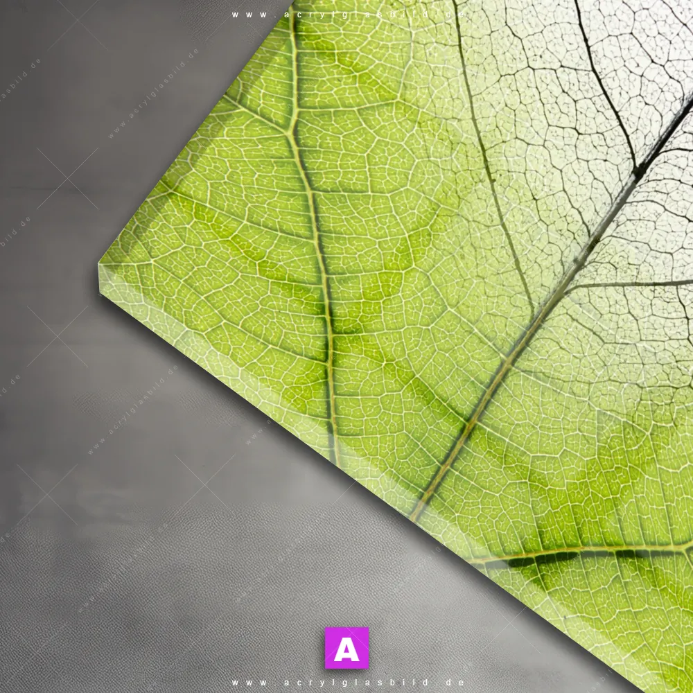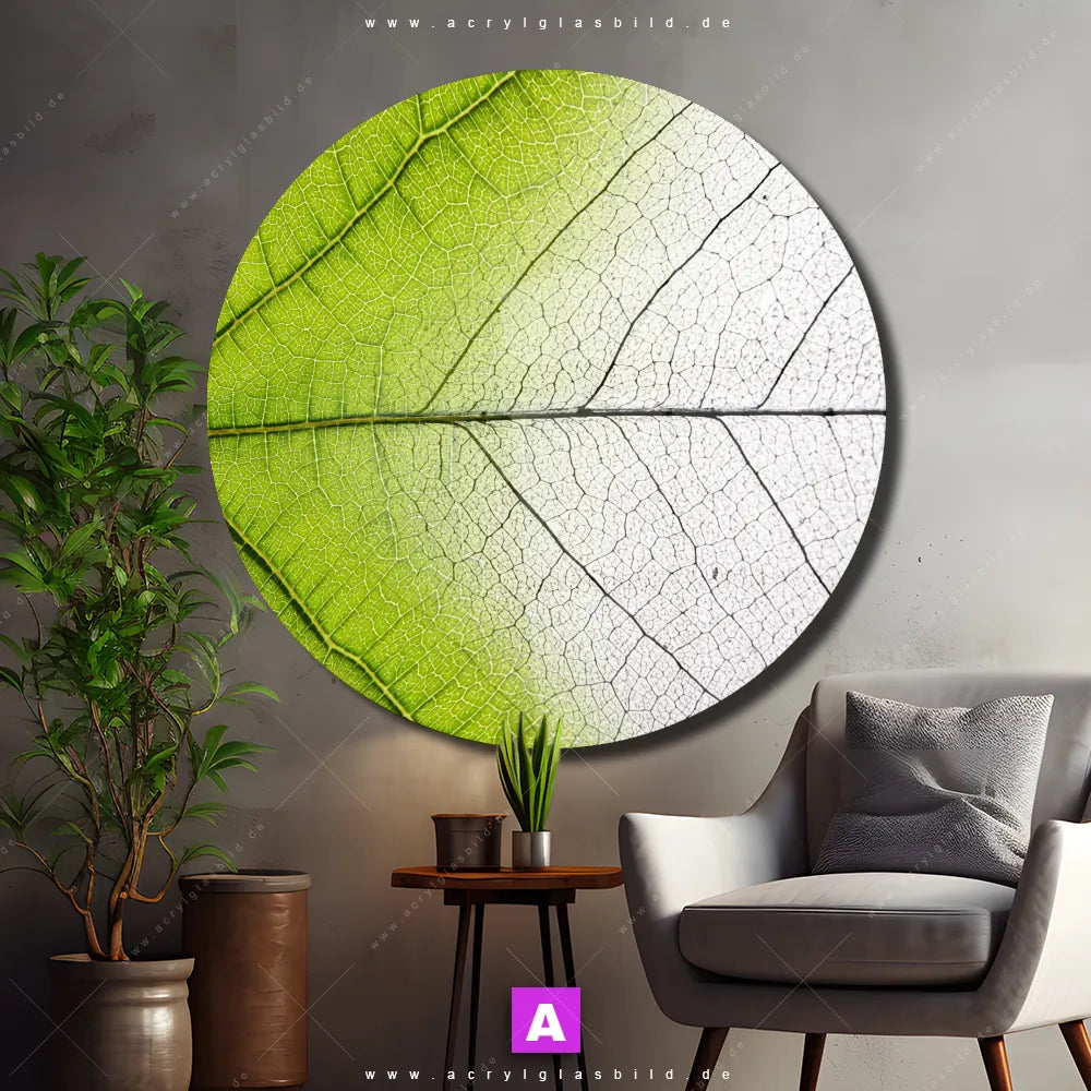 <b>Produktart:</b> Acrylglasbild | Glasbild | Wandbild aus Kunstglas | <b> Motiv:</b> Grünes Blatt | <b> Bildausrichtung:</b> Rund | <b> Max. Motiv-Größe:</b> 180cm breit | 130cm hoch | <b> Verfügbare Formate: </b> Quadrat, Querformat, Hochformat, Panorama, Schmal, Rund | <b> Kategorie:</b> Muster - Texturen, Blumen - Botanik | <b> Farben:</b> Weiss, Grün | <b> Kunstformen:</b> Fotografie | <b> Kunststile:</b> Modern Art, Floral
