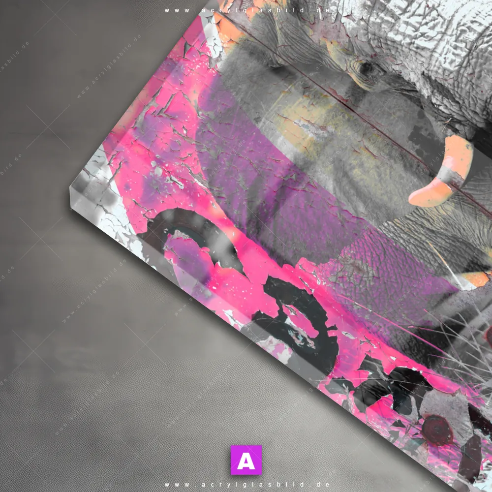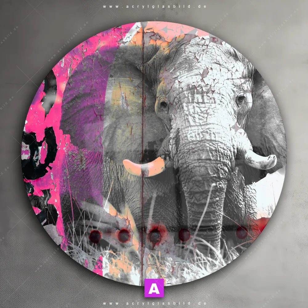 <b>Produktart:</b> Acrylglasbild | Glasbild | Wandbild aus Kunstglas | <b> Motiv:</b> Grunge Elefant | <b> Bildausrichtung:</b> Rund | <b> Max. Motiv-Größe:</b> 320cm breit | 240cm hoch | <b> Verfügbare Formate: </b> Quadrat, Querformat, Hochformat, Panorama, Schmal, Rund | <b> Kategorie:</b> Tierwelt | <b> Farben:</b> Pink, Grau , Lila, Weiss, Schwarz | <b> Kunstformen:</b> Digitale Kunst | <b> Kunststile:</b> Modern Art, Abstrakt, Pop Art
