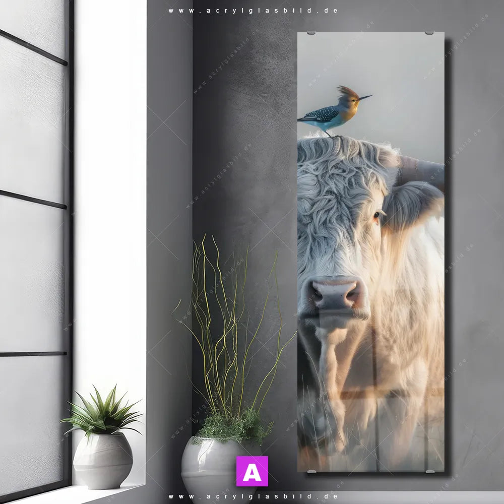 <b>Produktart:</b> Acrylglasbild | Glasbild | Wandbild aus Kunstglas | <b> Motiv:</b> Hochlandrind & bunter Vogel | <b> Bildausrichtung:</b> Schmal | <b> Max. Motiv-Größe:</b> 300cm breit | 300cm hoch | <b> Verfügbare Formate: </b> Quadrat, Querformat, Hochformat, Panorama, Schmal, Rund | <b> Kategorie:</b> Tierwelt | <b> Farben:</b> Grau , Beige | <b> Kunstformen:</b> KI-generiertes Bild | <b> Kunststile:</b> Natürlich - Realistisch, Modern Art, Schwarz - Weiss