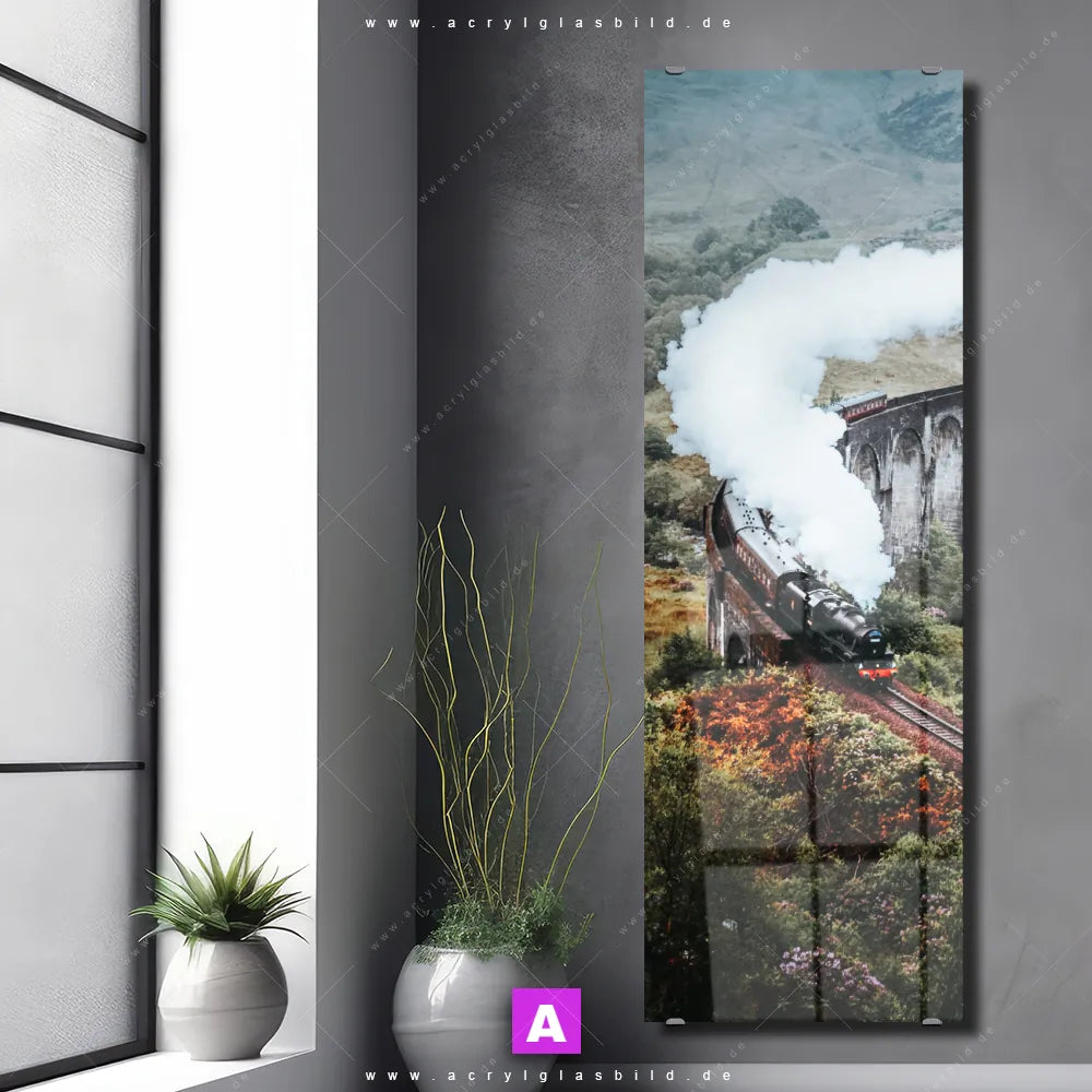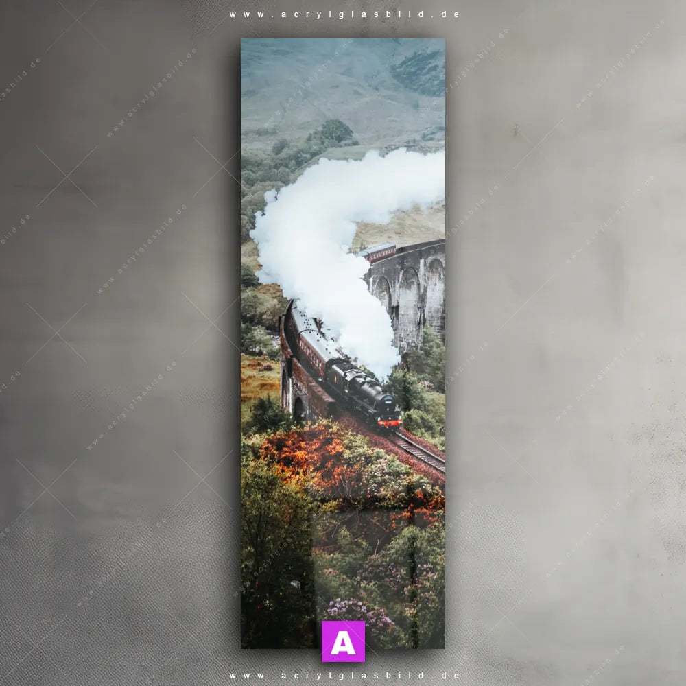 <b>Produktart:</b> Acrylglasbild | Glasbild | Wandbild aus Kunstglas | <b> Motiv:</b> Hogwarts-Express | <b> Bildausrichtung:</b> Schmal | <b> Max. Motiv-Größe:</b> 303cm breit | 180cm hoch | <b> Verfügbare Formate: </b> Quadrat, Querformat, Hochformat, Panorama, Schmal, Rund | <b> Kategorie:</b> Fahrzeuge, Landschaften | <b> Farben:</b> Ocker, Braun, Grün, Grau , Orange | <b> Kunstformen:</b> Fotografie | <b> Kunststile:</b> Natürlich - Realistisch