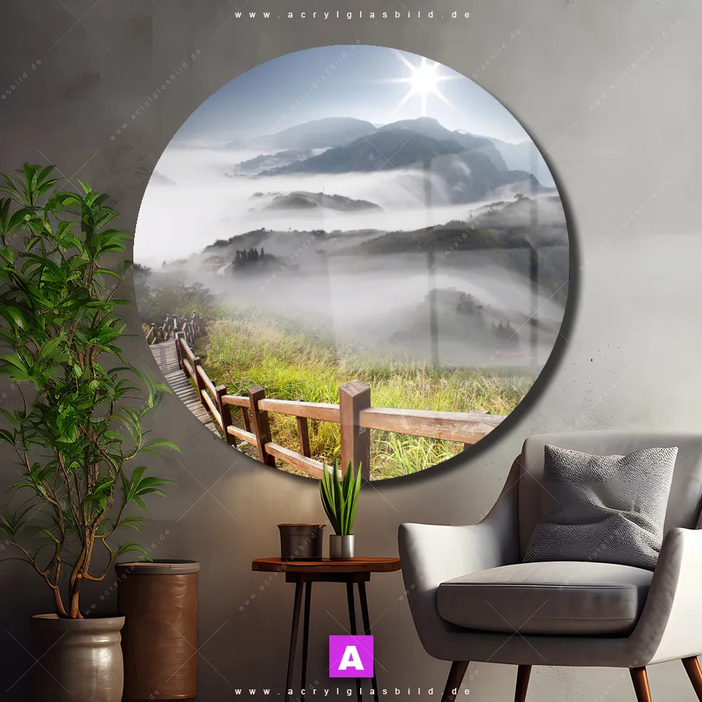 Hey du! Bist du es auch leid, auf langweilige, weiße Wände in deinem Raum zu starren und dich zu fragen, ob das der Sinn des Lebens ist? Unser Acrylglasbild mit dem Titel Holztreppe auf Berg mit Wolken im Format Rund verwandelt deine Wand in ein Kunstwerk und macht deinen Raum zum absoluten Hingucker.