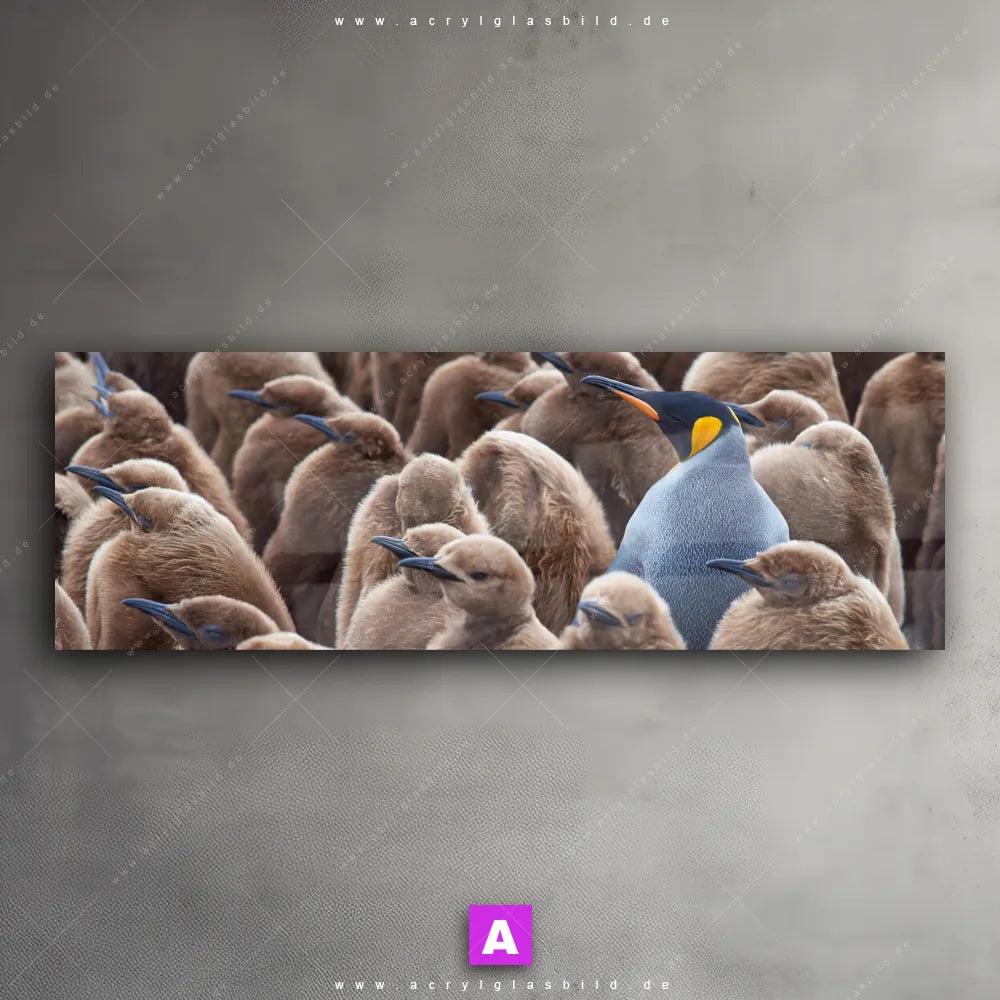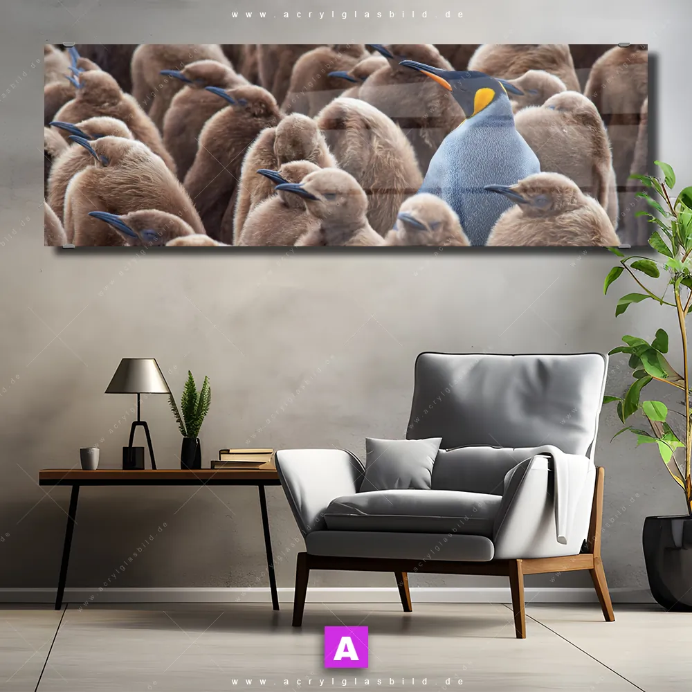 Fehlt dir die Inspiration beim Anblick deiner Wände, sodass selbst das Zählen der Wandfarbtropfen aufregender erscheint? Keine Sorge, wir haben das perfekte Kunstwerk für dich! Mit unserem Acrylglasbild Königspinguine im Panorama-Format verleihst du deinem Raum den dringend benötigten Wow-Faktor. Lass deine Wände mit unserem Nachwuchs Pinguine Acrylglasbild zum Star werden!