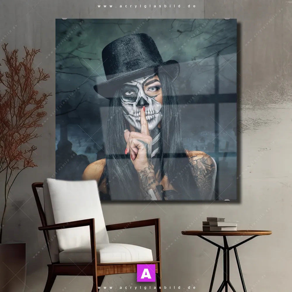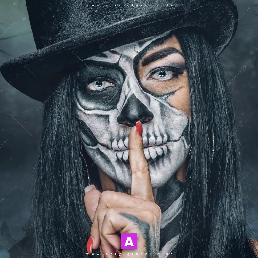 Begriffe wie Frau, Porträt, modern, Beauty, Gesicht, Körper, Make-up, Totenkopf, Schädel, Halloween, Tag der Toten, Santa Muerte haben Dich auf der Suche nach Deinem neuen Wandbild aus Acrylglas inspiriert? Dann sollte das Acrylglasbild Tag der Toten den Weg zu Dir finden.