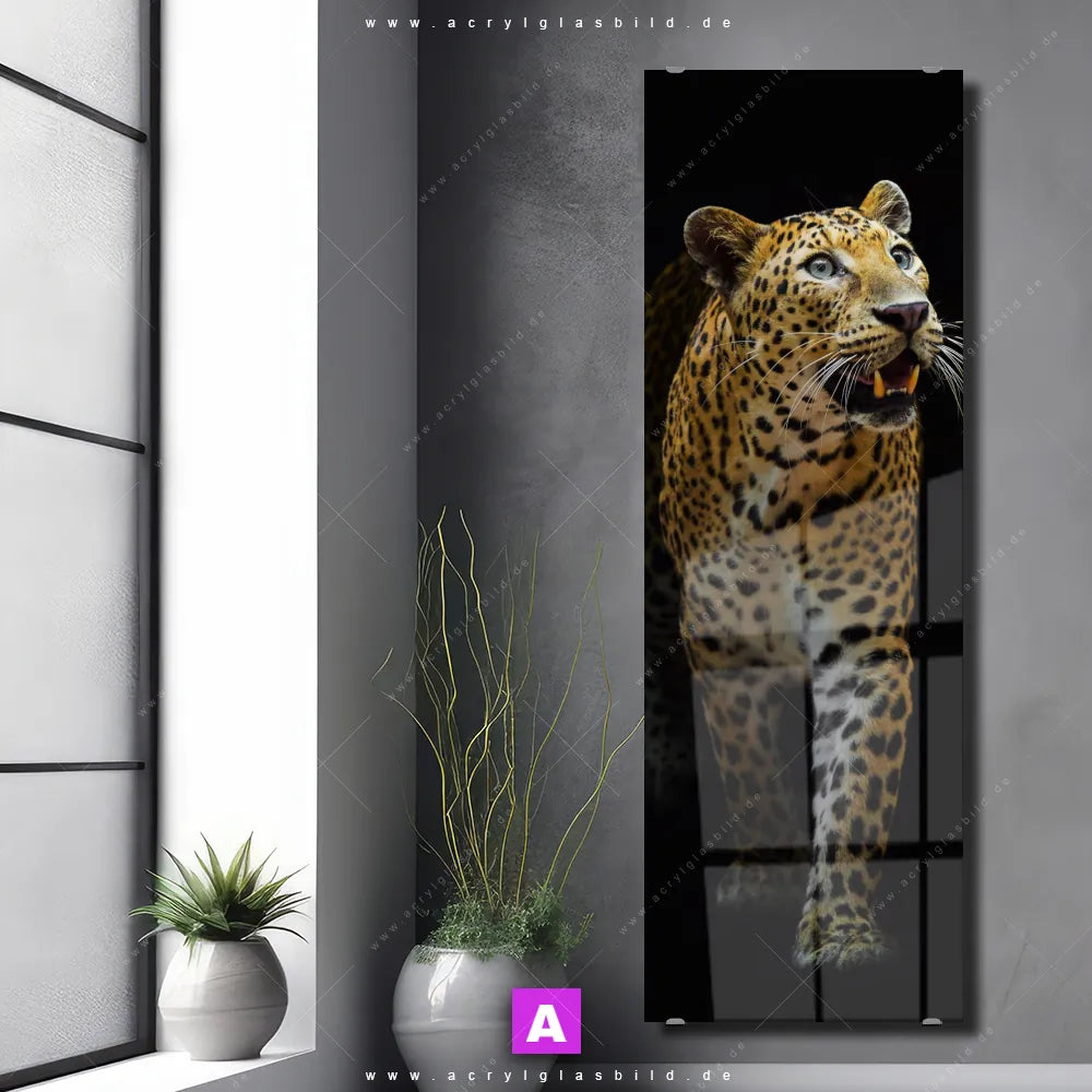 <b>Produktart:</b> Acrylglasbild | Glasbild | Wandbild aus Kunstglas | <b> Motiv:</b> Leopard in der Dunkelheit | <b> Bildausrichtung:</b> Schmal | <b> Max. Motiv-Größe:</b> 130cm breit | 150cm hoch | <b> Verfügbare Formate: </b> Quadrat, Querformat, Hochformat, Panorama, Schmal, Rund | <b> Kategorie:</b> Tierwelt | <b> Farben:</b> Schwarz, Beige | <b> Kunstformen:</b> Fotografie | <b> Kunststile:</b> Natürlich - Realistisch