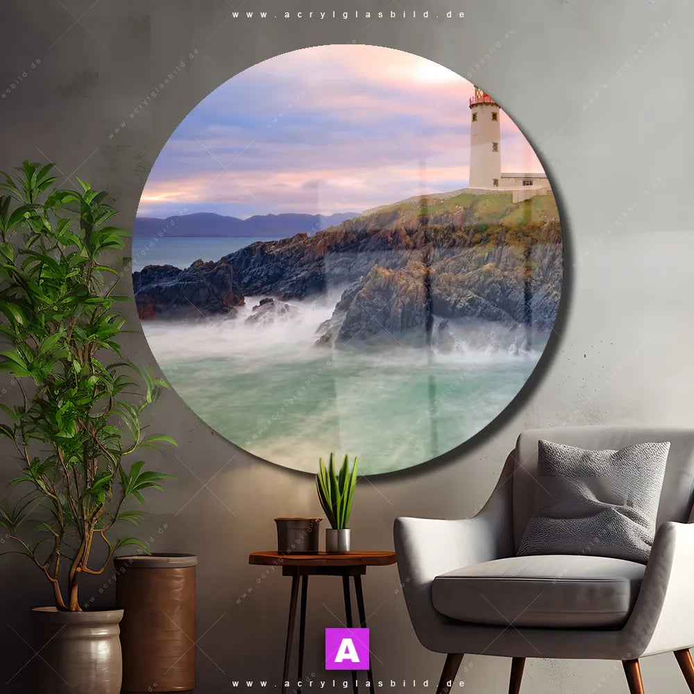 <b>Produktart:</b> Acrylglasbild | Glasbild | Wandbild aus Kunstglas | <b> Motiv:</b> Leuchtturm bei stürmischer See | <b> Bildausrichtung:</b> Rund | <b> Max. Motiv-Größe:</b> 450cm breit | 300cm hoch | <b> Verfügbare Formate: </b> Quadrat, Querformat, Hochformat, Panorama, Schmal, Rund | <b> Kategorie:</b> Strand - Meer, Landschaften | <b> Farben:</b> Blau, Grün, Lila, Orange | <b> Kunstformen:</b> Fotografie | <b> Kunststile:</b> Natürlich - Realistisch