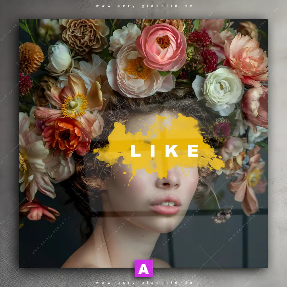 <b>Produktart:</b> Acrylglasbild | Glasbild | Wandbild aus Kunstglas | <b> Motiv:</b> LIKE - Florales Porträt | <b> Bildausrichtung:</b> Quadrat | <b> Max. Motiv-Größe:</b> 270cm breit | 180cm hoch | <b> Verfügbare Formate: </b> Quadrat, Querformat, Hochformat, Panorama, Schmal, Rund | <b> Kategorie:</b> Porträts - Menschen, Blumen - Botanik | <b> Farben:</b> Schwarz, Rosa, Rot, Beige, Gelb | <b> Kunstformen:</b> Digitale Kunst | <b> Kunststile:</b> Floral, Modern Art, Retro - Vintage