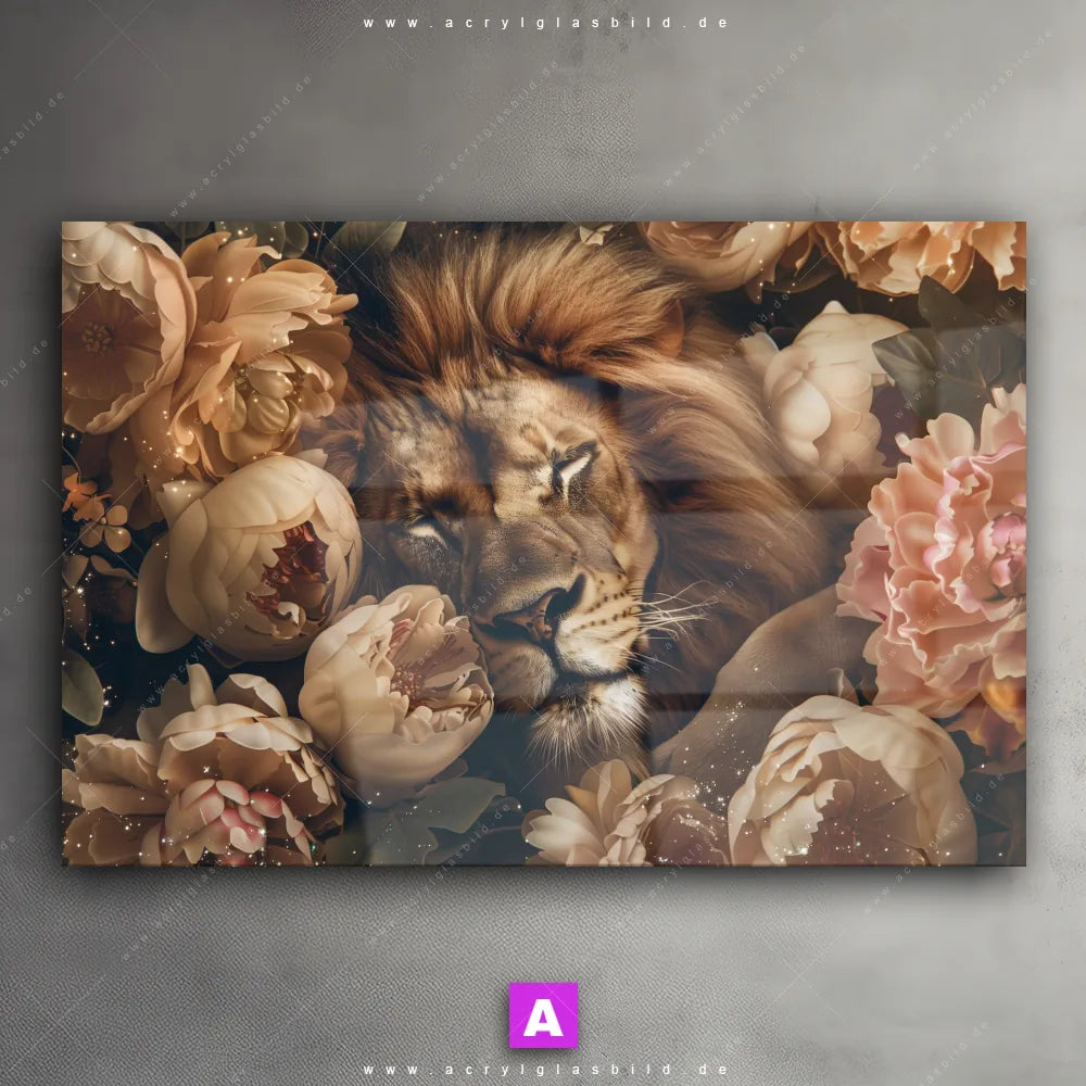 <b>Produktart:</b> Acrylglasbild | Glasbild | Wandbild aus Kunstglas | <b> Motiv:</b> Löwe schläft in Blüten | <b> Bildausrichtung:</b> Querformat | <b> Max. Motiv-Größe:</b> 450cm breit | 300cm hoch | <b> Verfügbare Formate: </b> Quadrat, Querformat, Hochformat, Panorama, Schmal, Rund | <b> Kategorie:</b> Tierwelt, Blumen - Botanik | <b> Farben:</b> Braun, Beige, Rosa | <b> Kunstformen:</b> Digitale Kunst | <b> Kunststile:</b> Floral, Modern Art